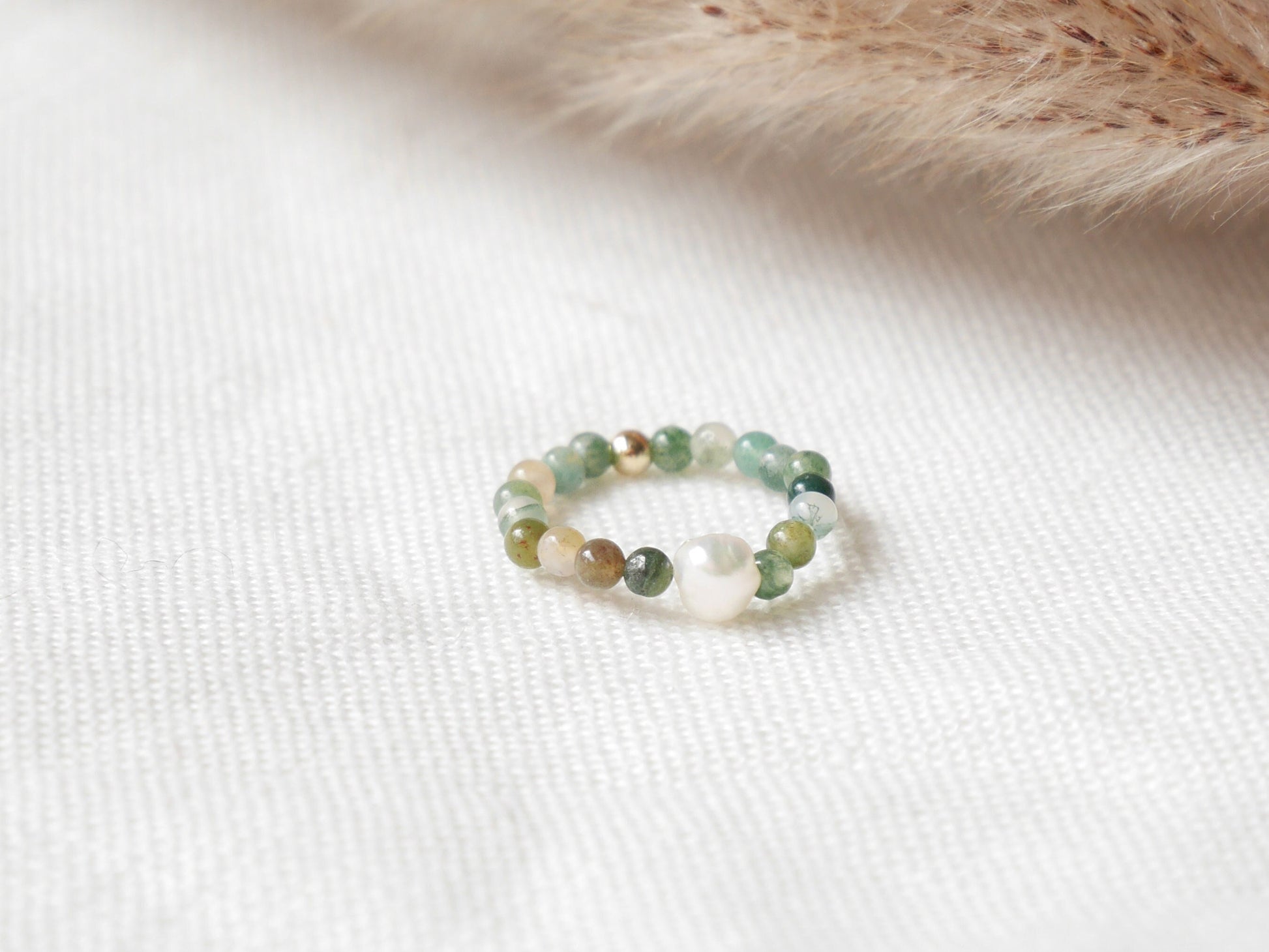 Agate stone ring | Dainty beaded jewelry | Elastic stretch ring with small stone beads | Cute ring gift for woman in green neutral colors
