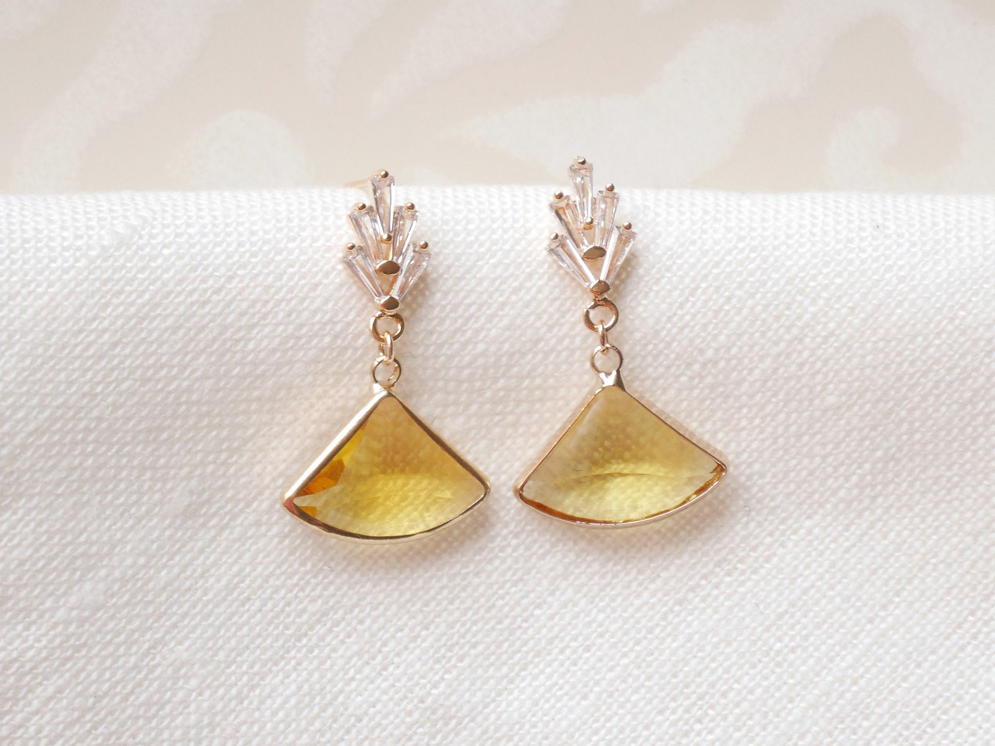 Elegant yellow fan art deco earrings – vintage bridal jewelry with glass pendant