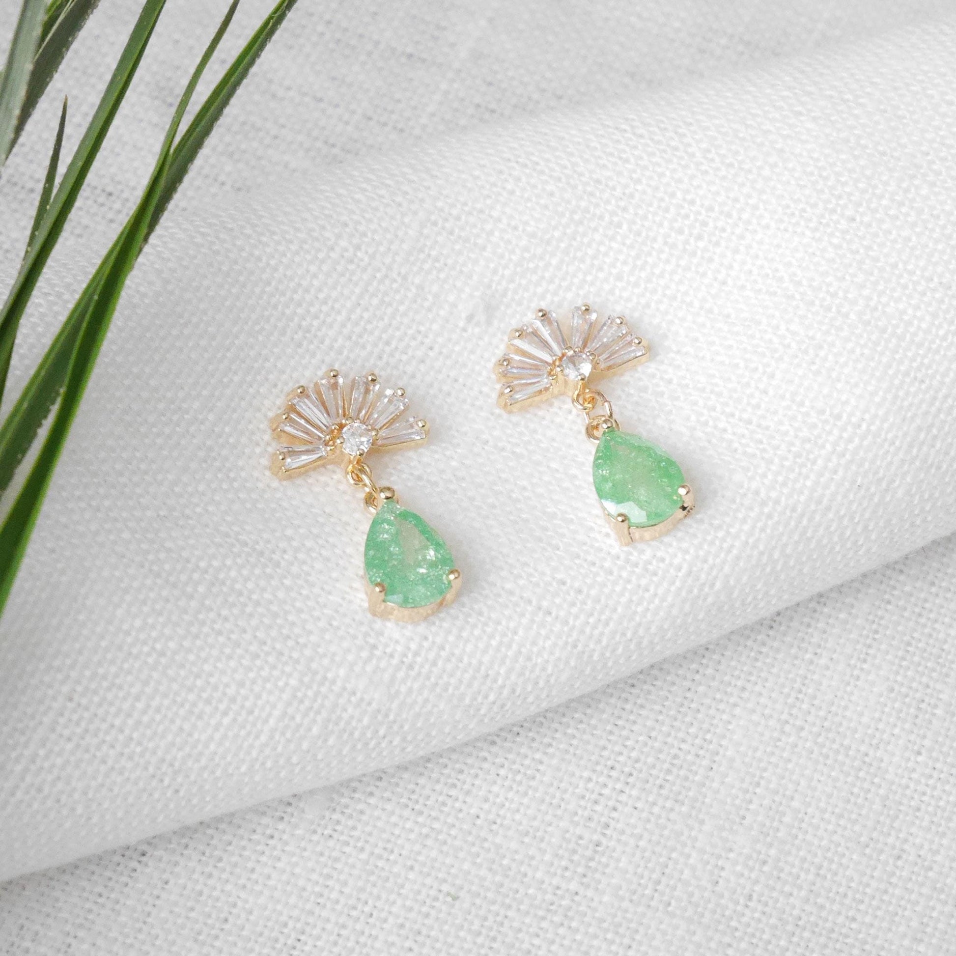 Art deco green drop earrings | Vintage style fan shape earring | Dainty cute CZ gold bridal jewelry | Elegant green crystal gift for her