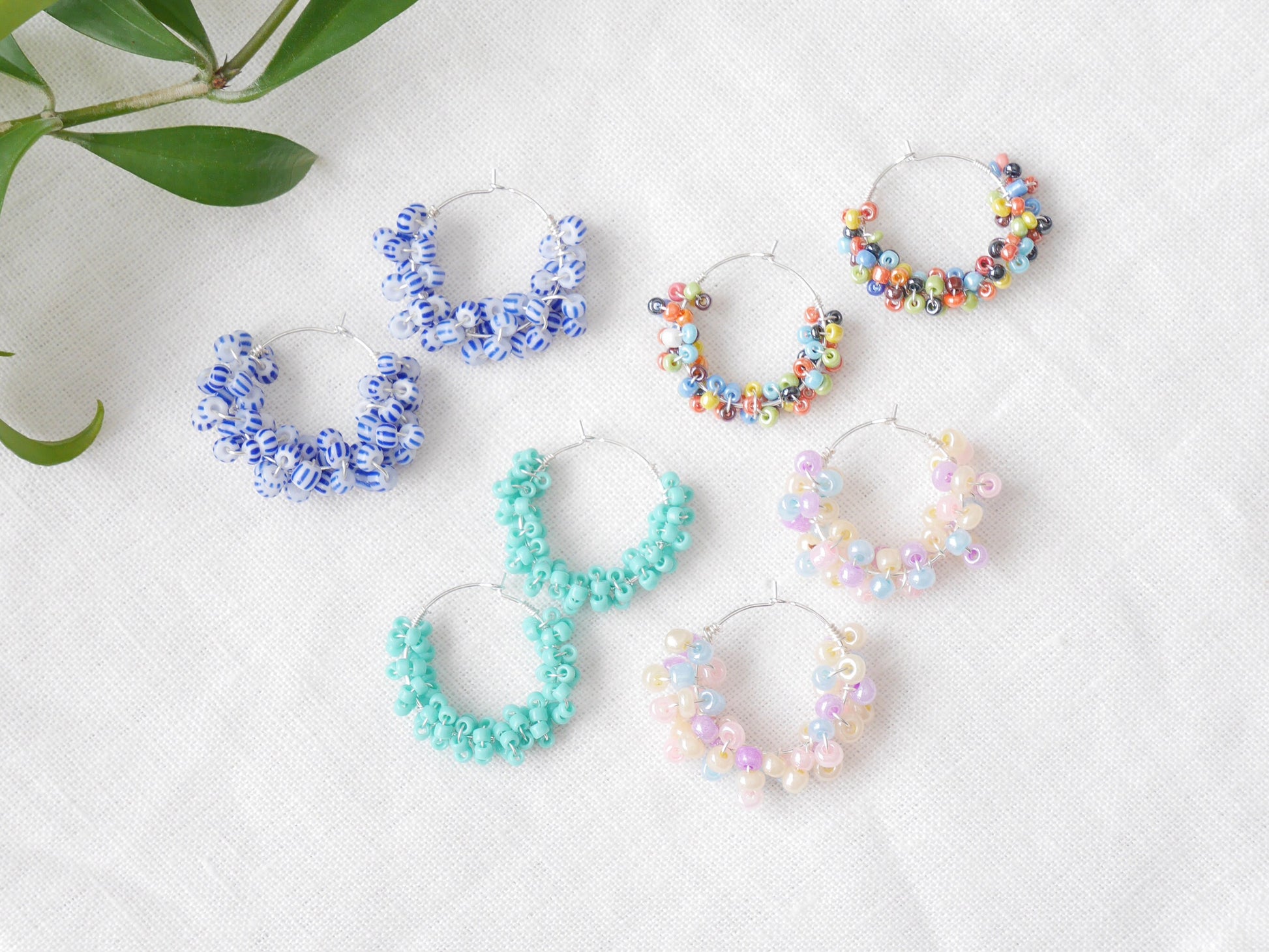 Blue and white hoop earrings | Round seed bead earrings | Beaded statement hoops | Nautical sailor sea theme | Handmade jewelry gift for her