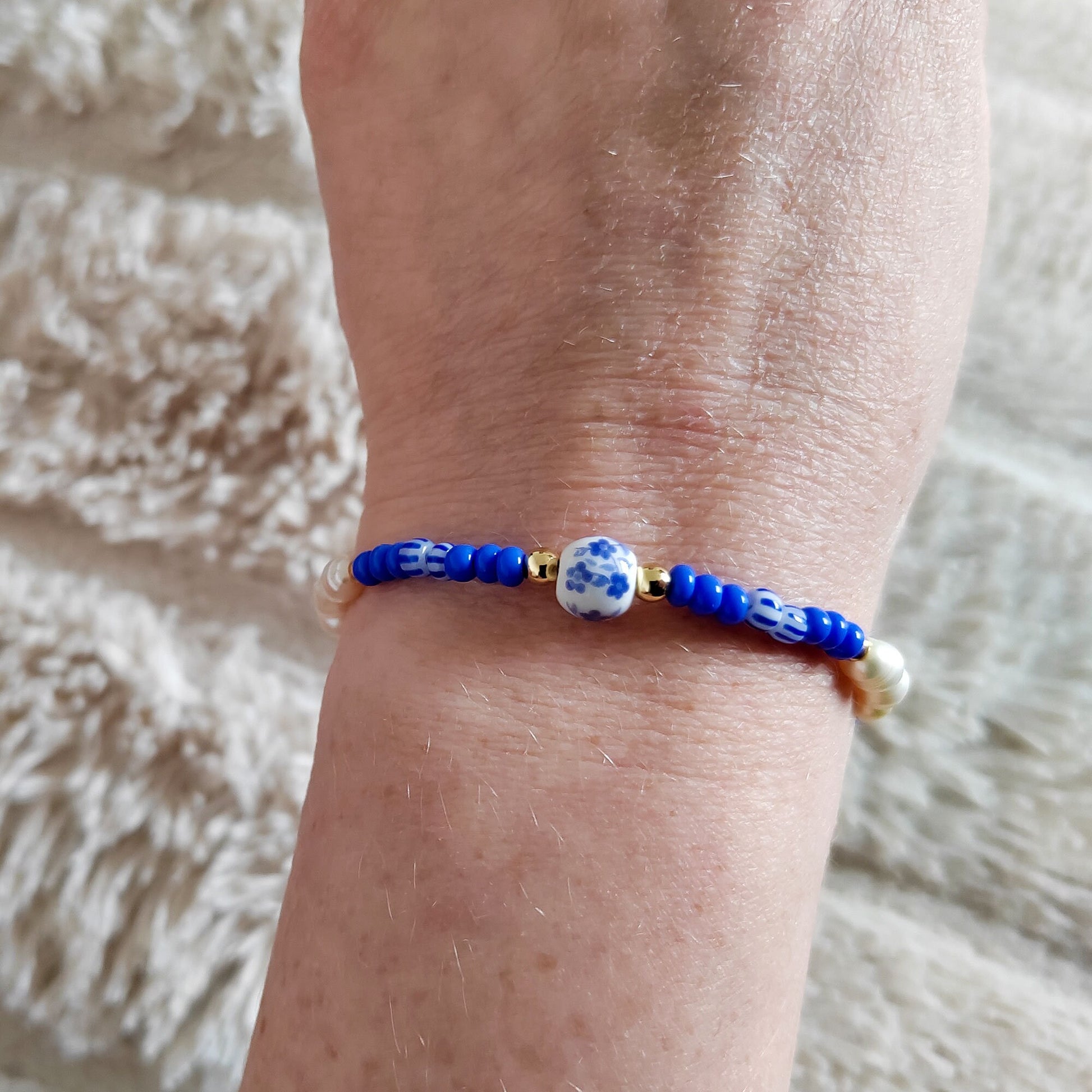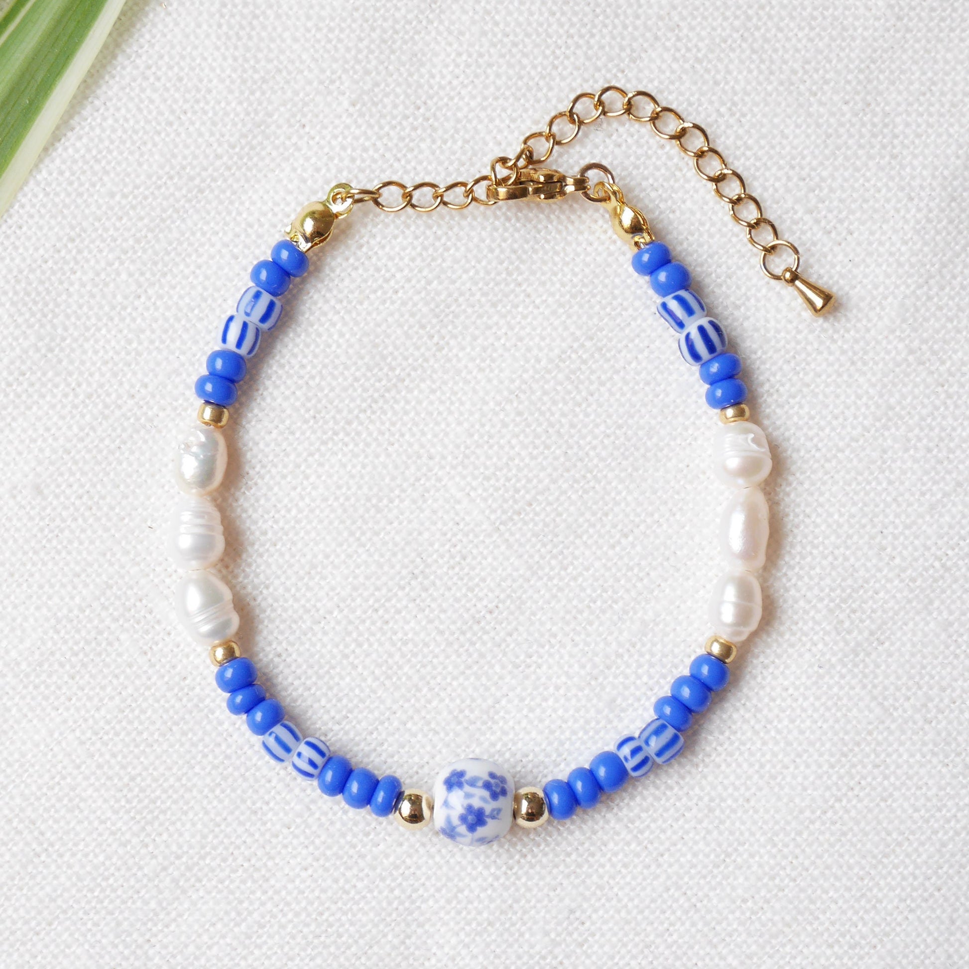Blue porcelain bead bracelet | Summer seed bead bracelet | Lovely blue and white jewelry with real pearls | Ceramic jewelry gift for her