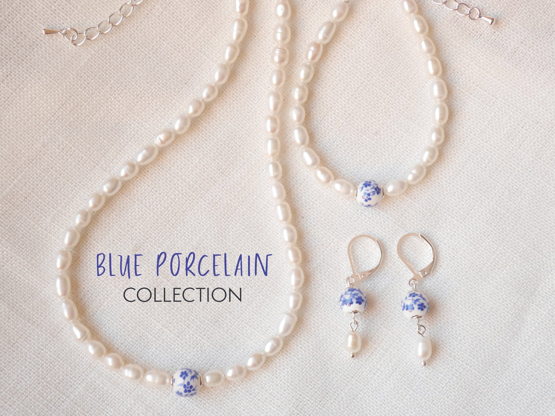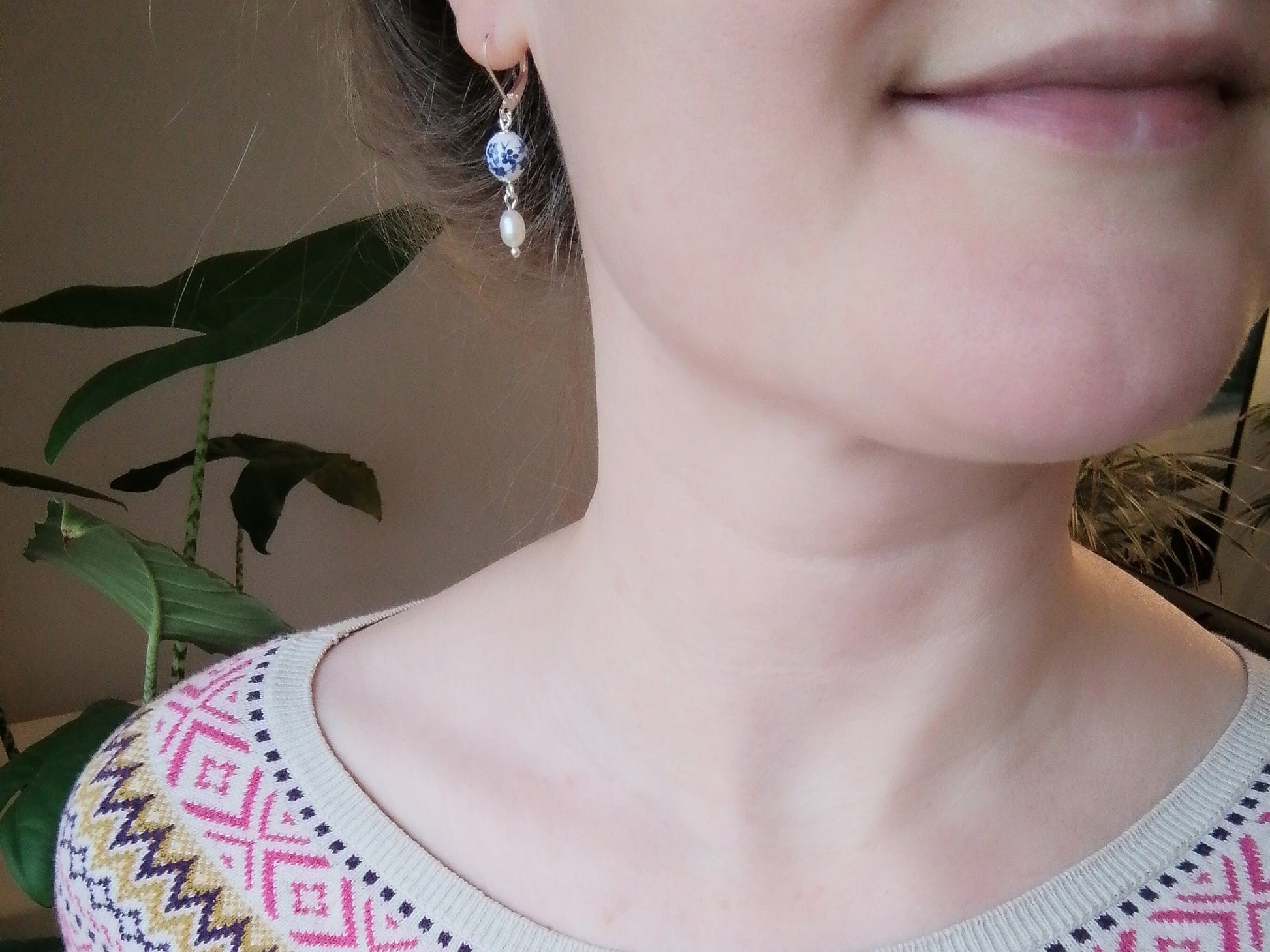 The blue porcelain pearl earrings are dainty and cute. In these light weight earrings, I have paired blue and white floral ceramic beads with genuine rice-shape freshwater pearls.