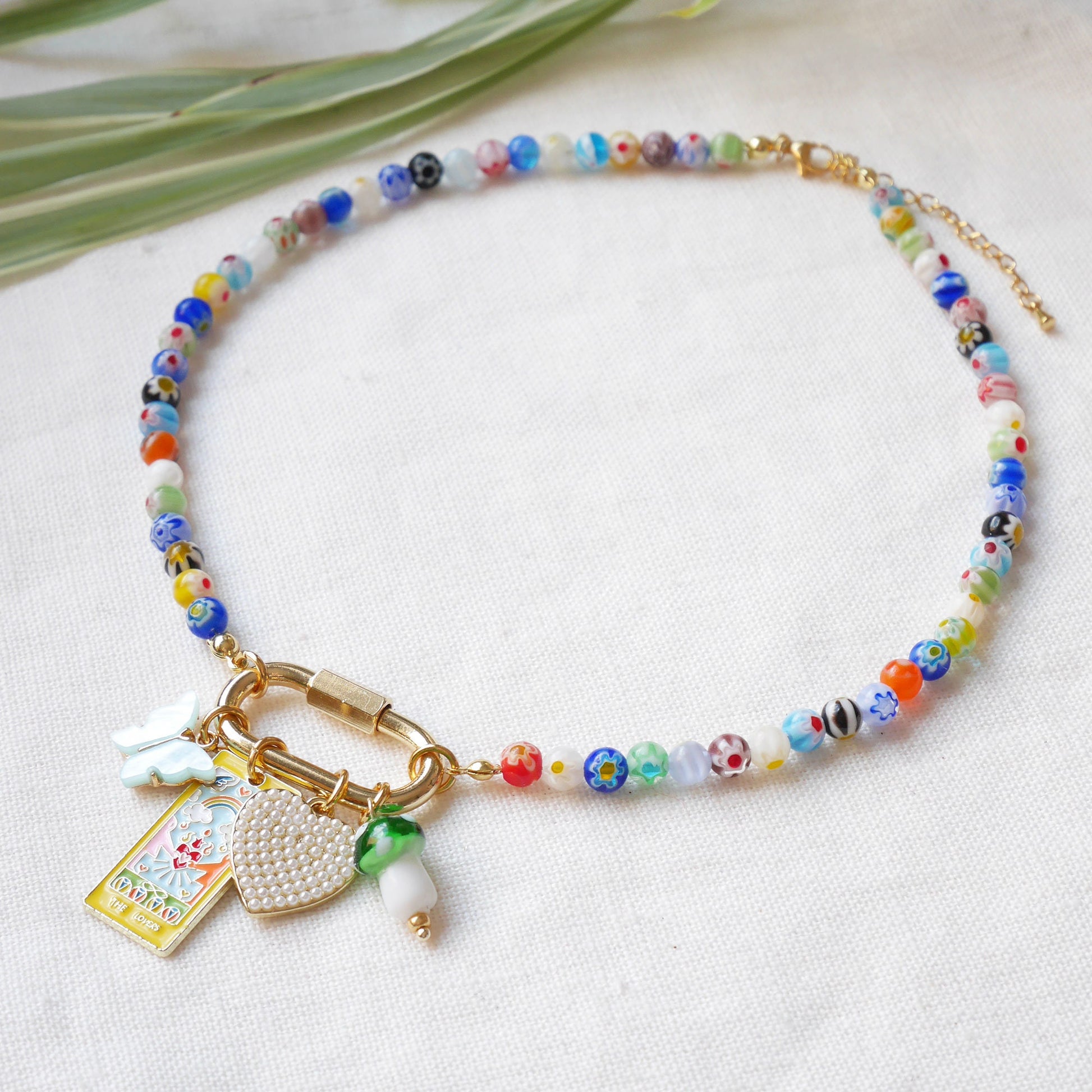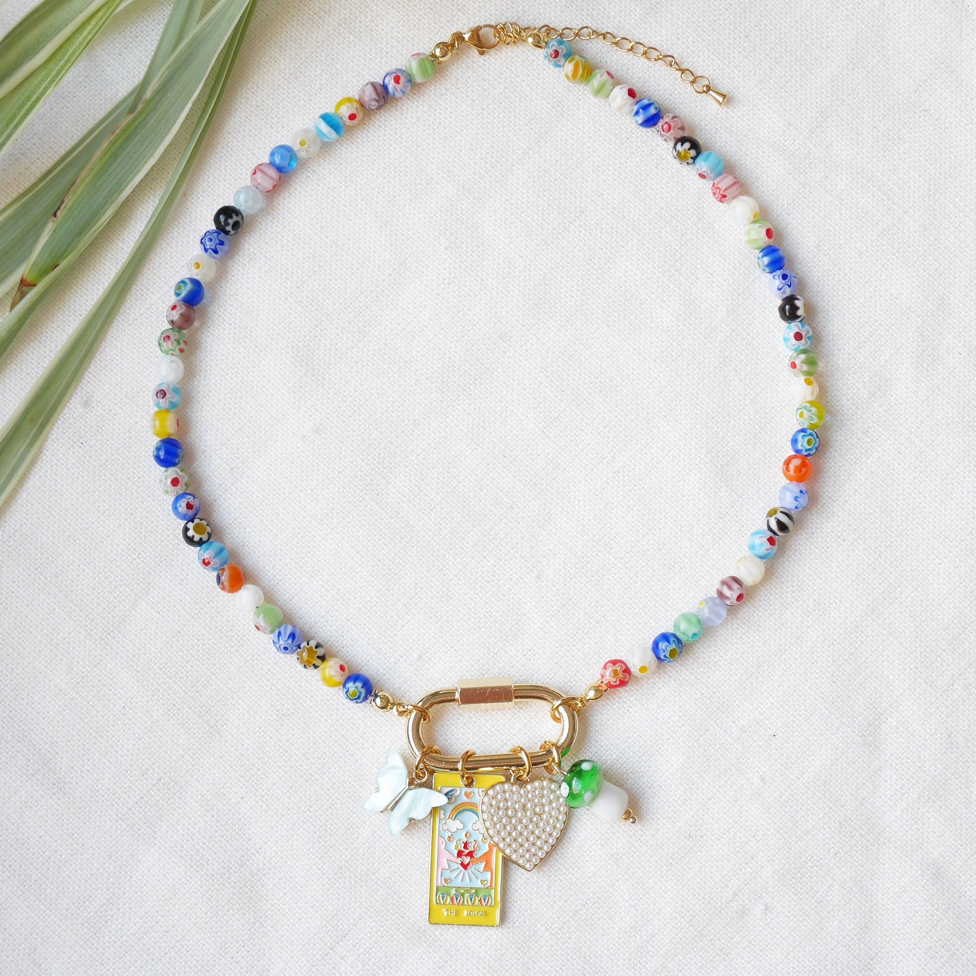 Custom carabiner millefiori necklace – adjustable gold-plated beaded jewelry with personalized charms