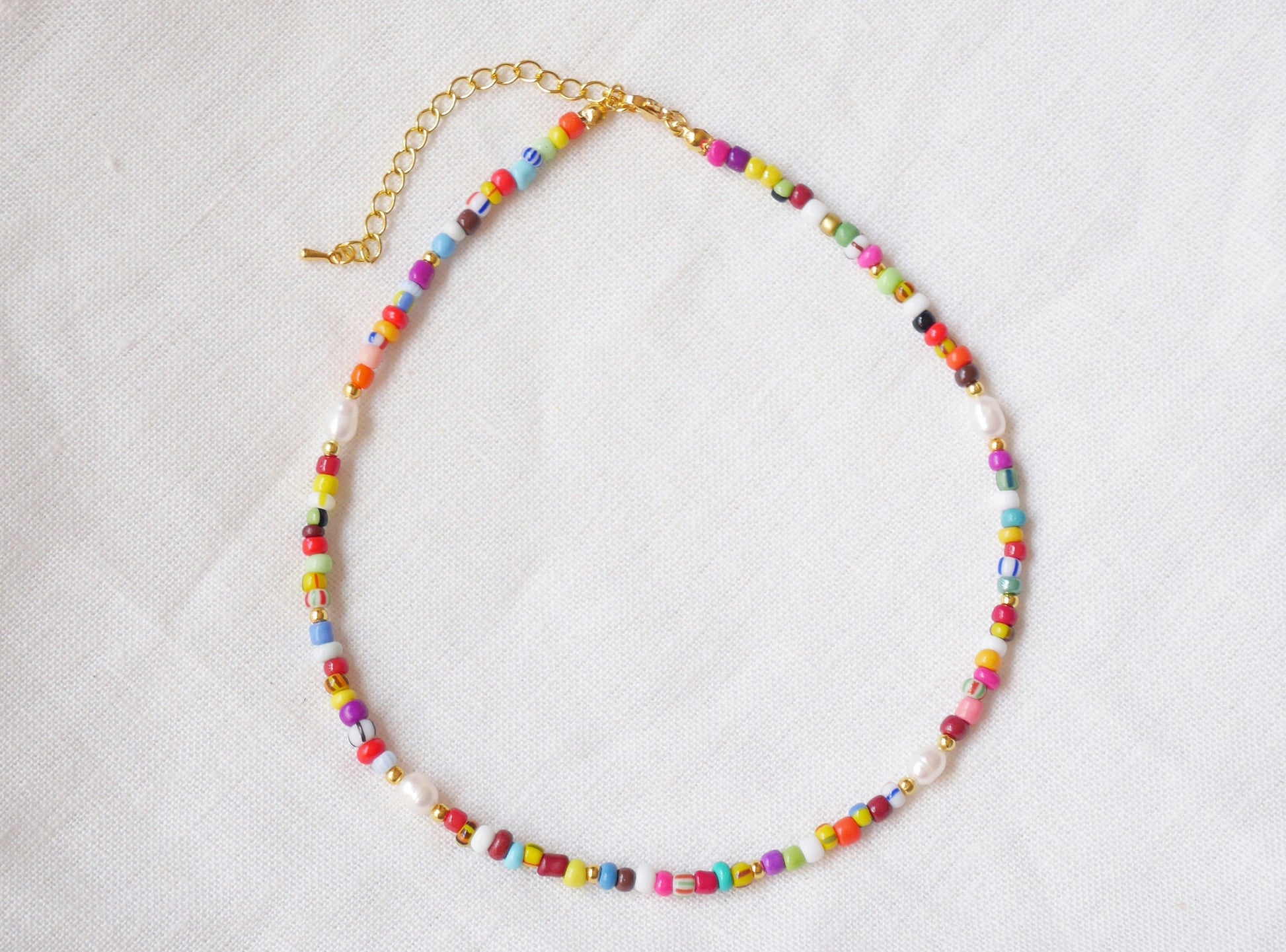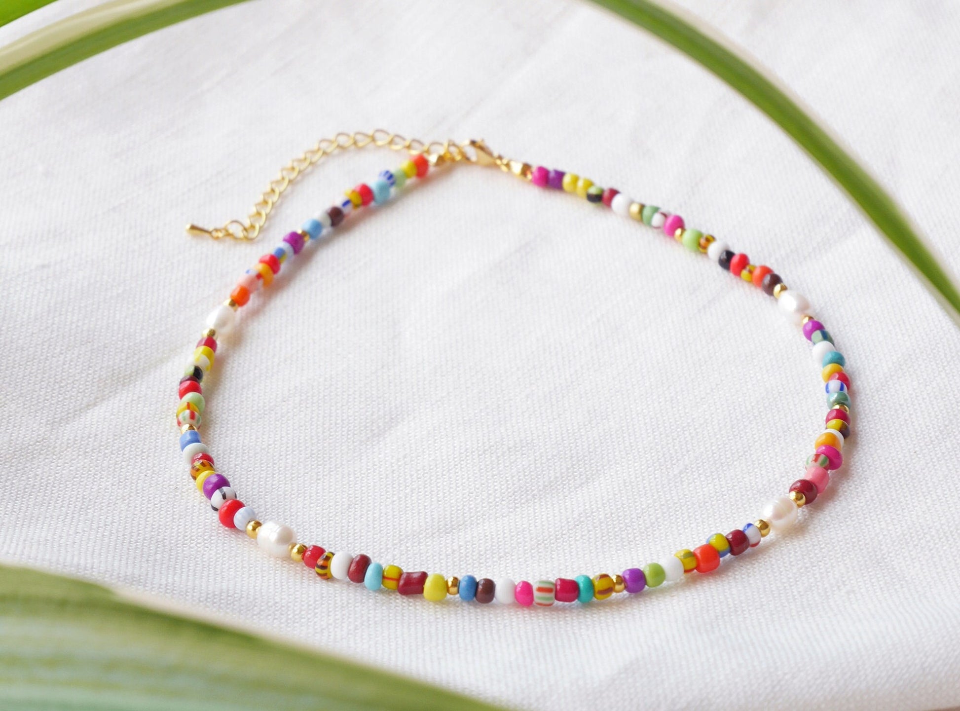 Colorful beaded necklace | Multicolor seed bead choker | Cute mixed glass beads and freshwater pearls jewelry | Handmade boho gift for her