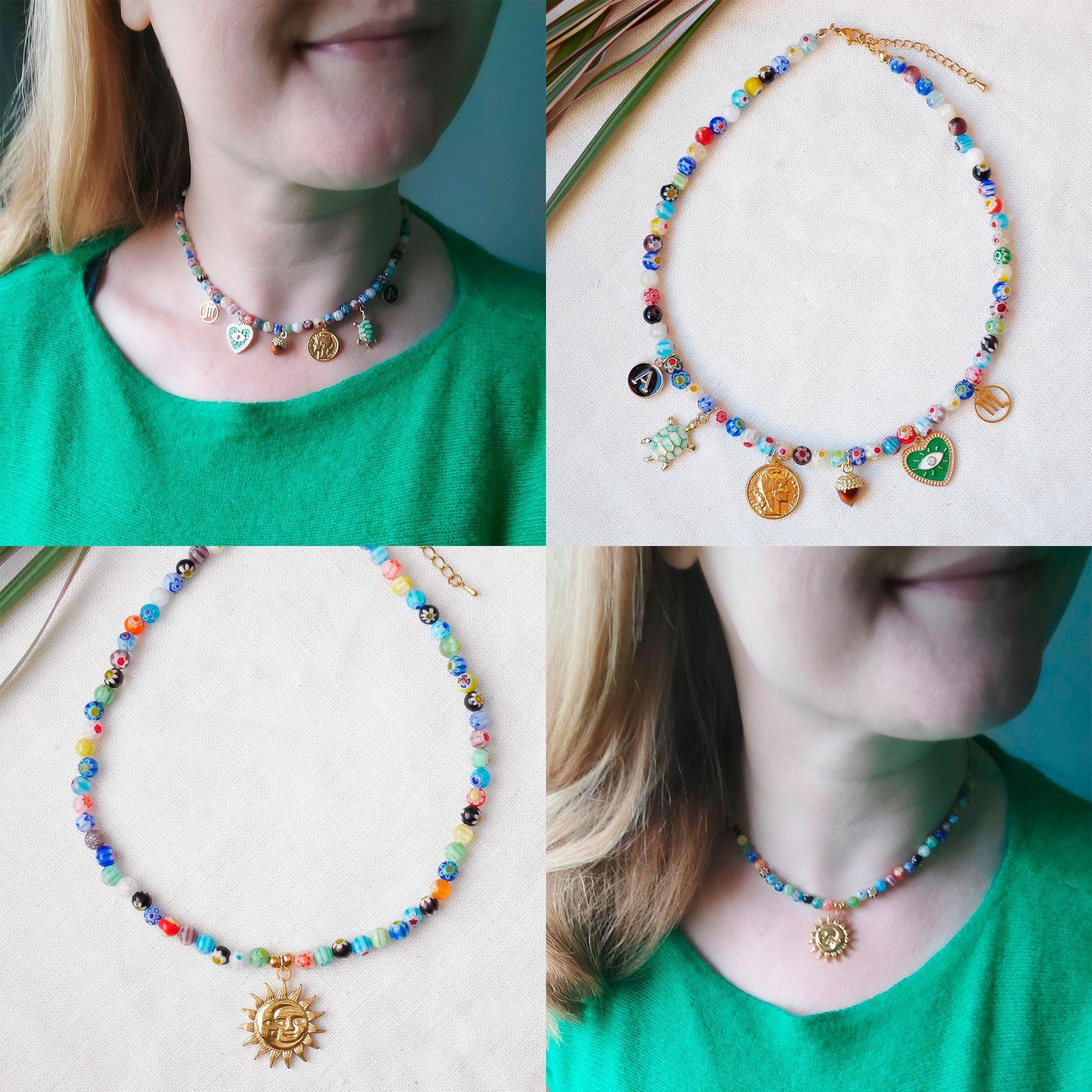 Colorful custom charms necklace | Personal Christmas gift | Millefiori glass bead choker with your choice of pendants | Cute present for her