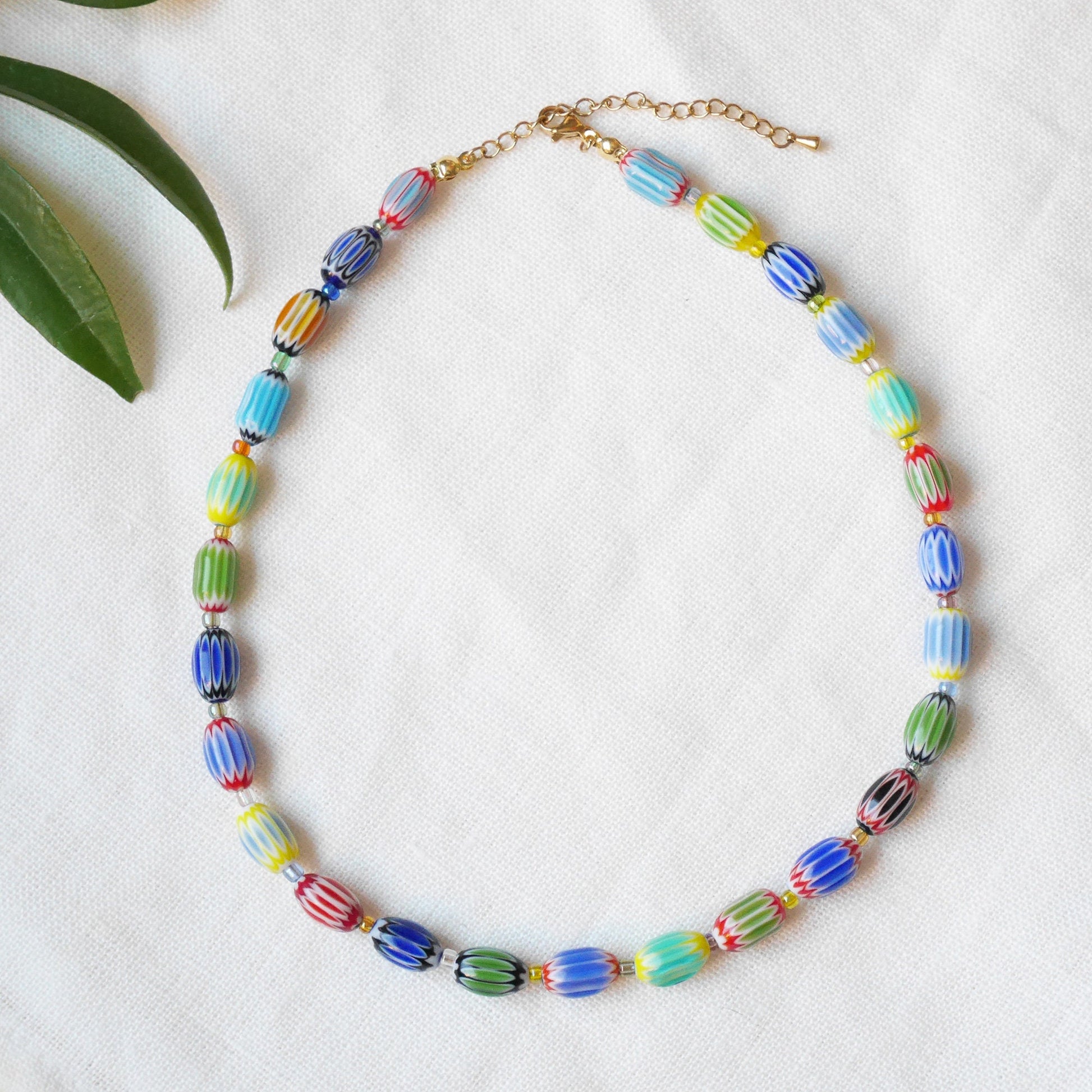 Colorful glass bead necklace | Multicolor choker with barrel shaped beads | Fun beaded oval glass tube necklace | Unique cute beaded jewelry