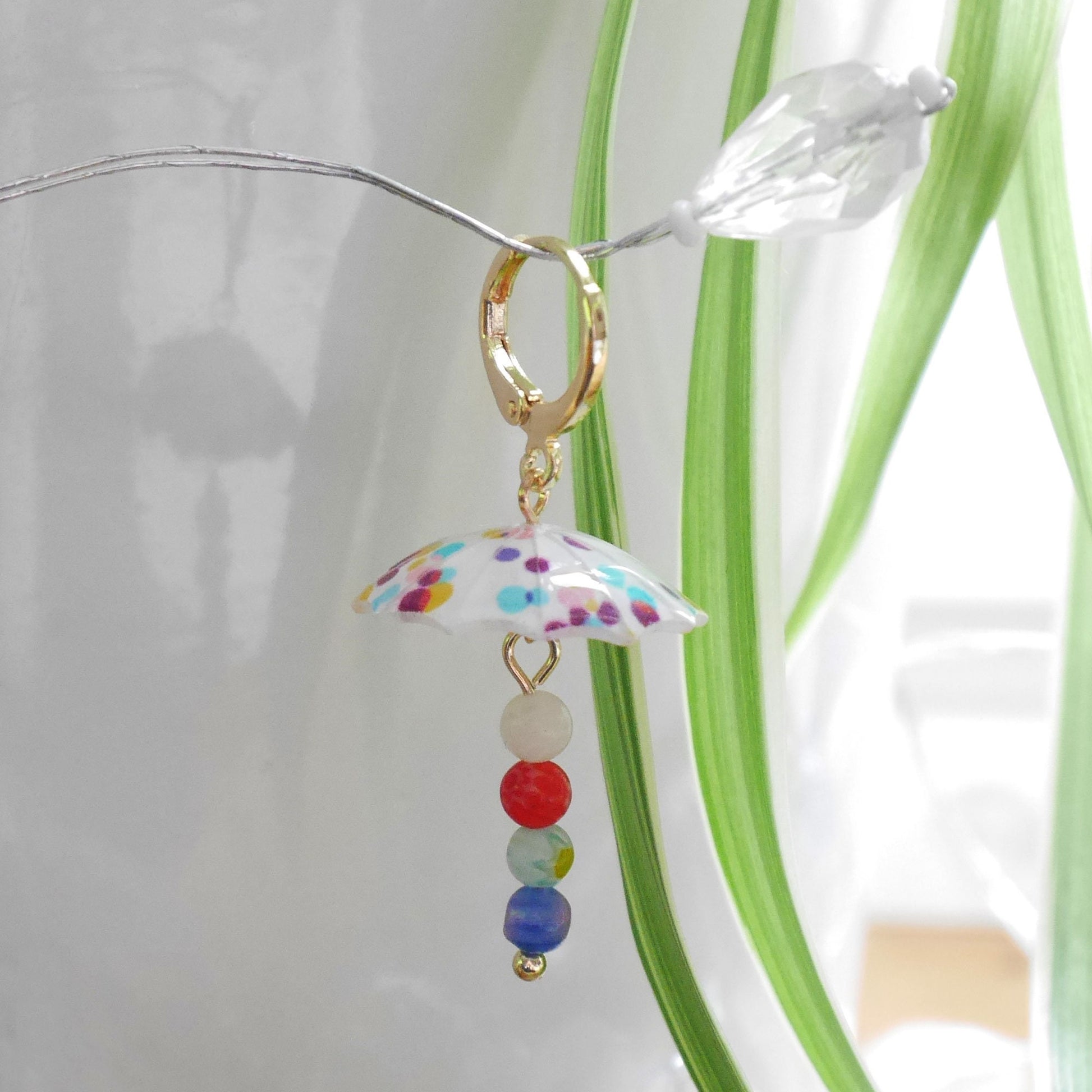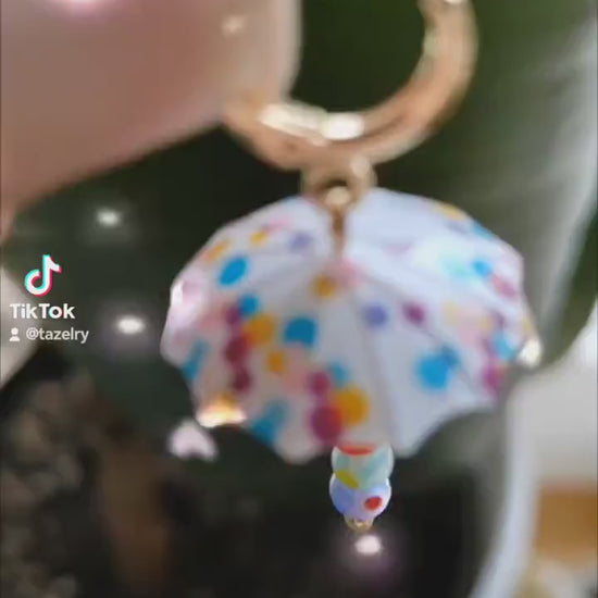 Rainy day earrings are an instant pick-me-up on a cloudy day. In these quirky and cute umbrella earrings, I have paired colorful acrylic umbrellas with millefiori glass beads (4mm) and 14k gold-plated ear wires of your choice.