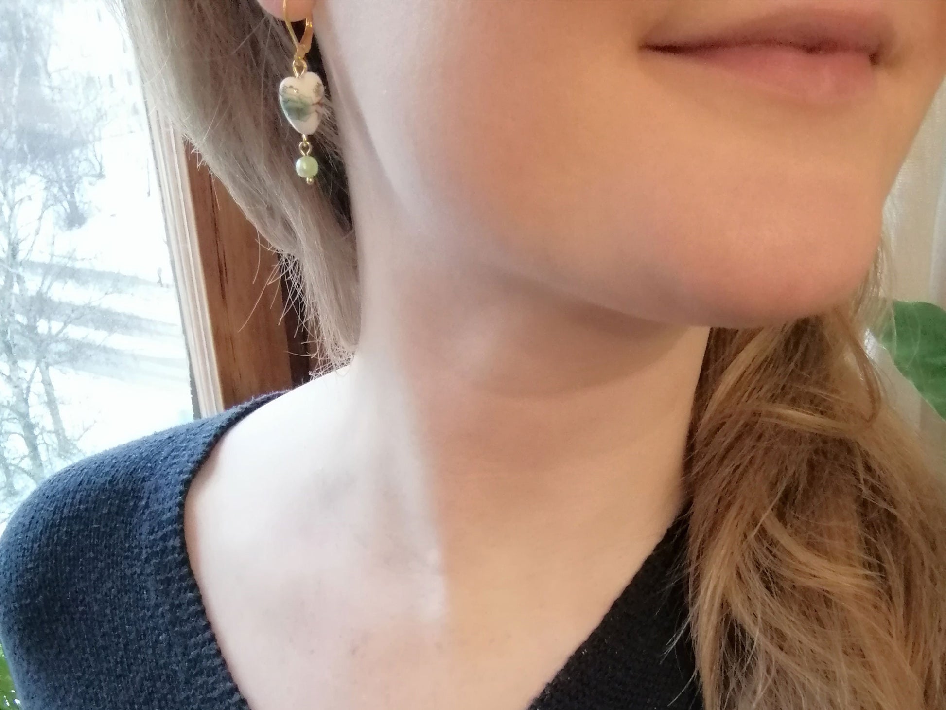 Dainty porcelain earrings are dainty and cute. In these gold plated earrings, I have paired a heart-shaped ceramic bead with a cute small light green freshwater pearl. The color combination is very elegant - the earrings look almost vintage but still modern at the same time. Handy lever-back closure that looks nice and makes sure you won't lose your earrings.