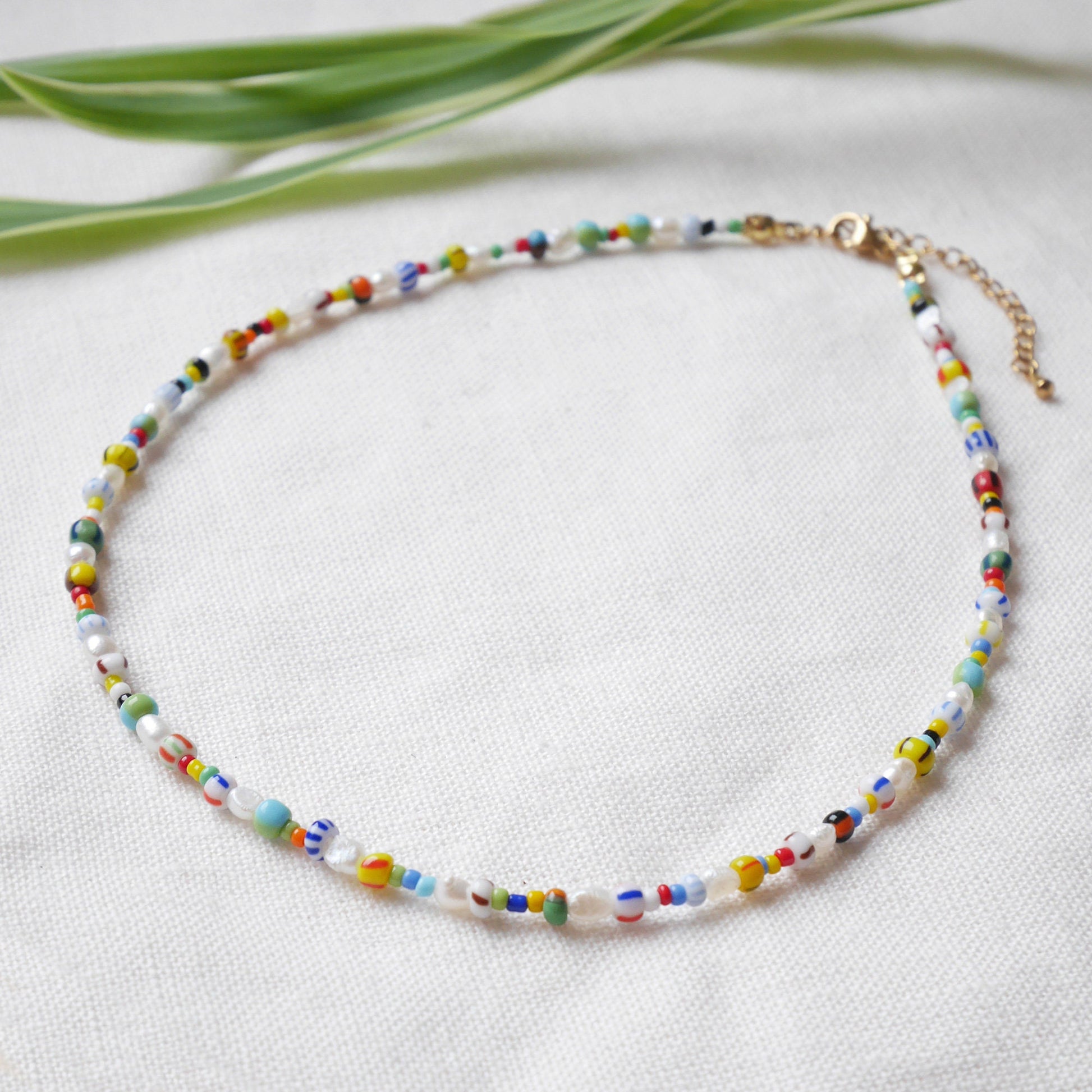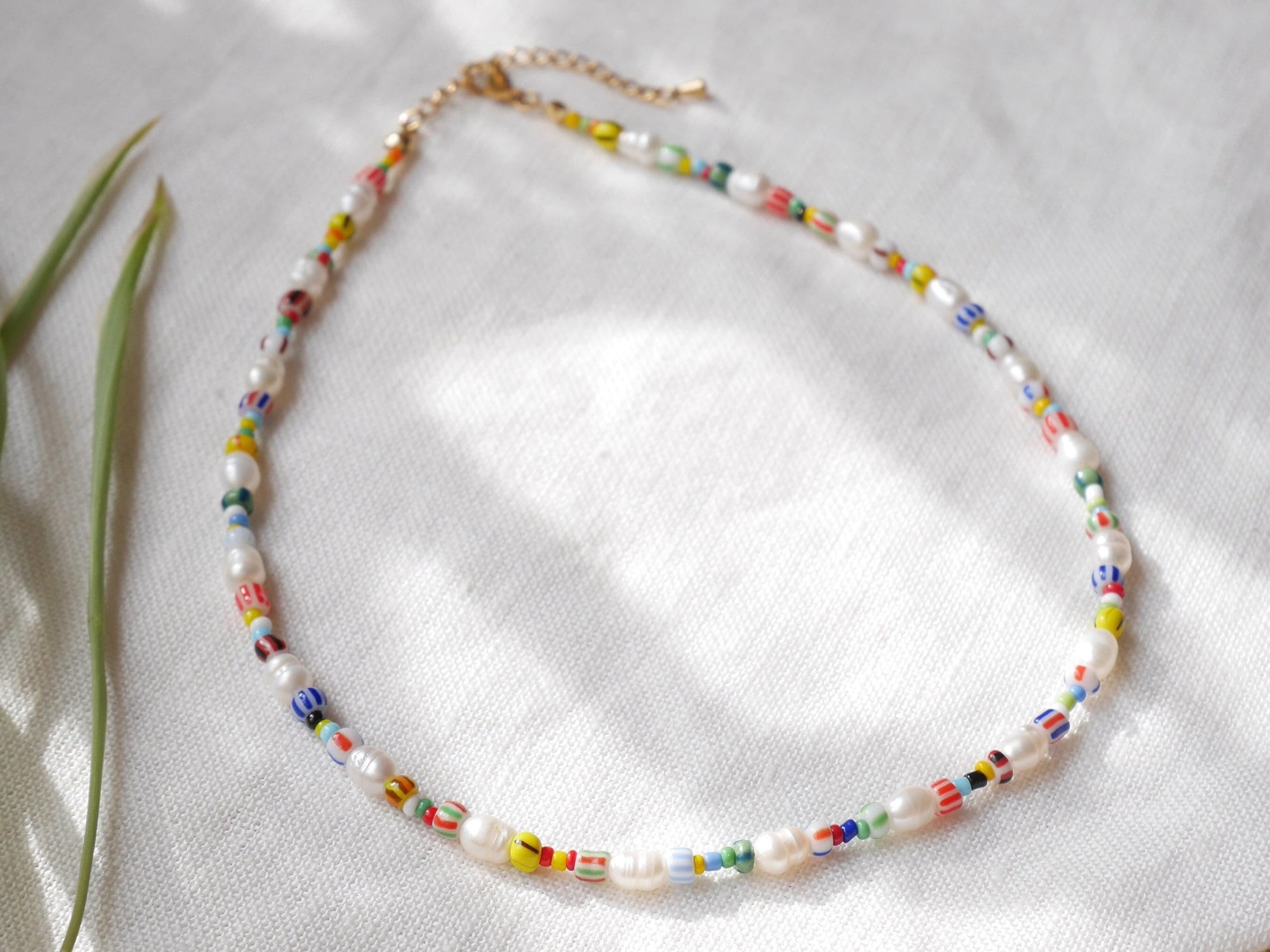 Freshwater pearl necklace with striped beads | Colorful beaded necklace | Mixed seed bead choker | Multicolor summer jewelry gift for her