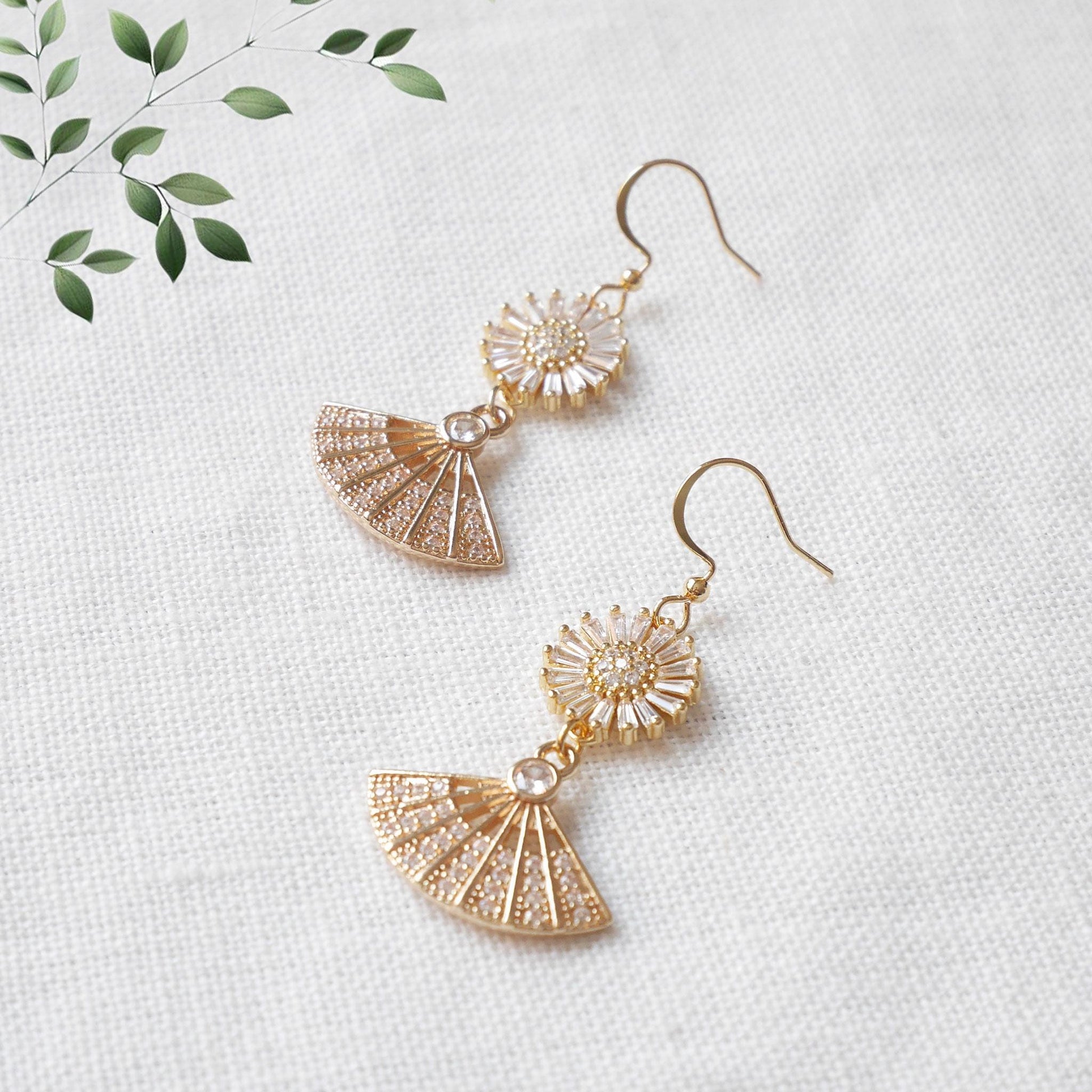 Gold daisy fan dangle earrings – floral bridal jewelry with cz drop accents