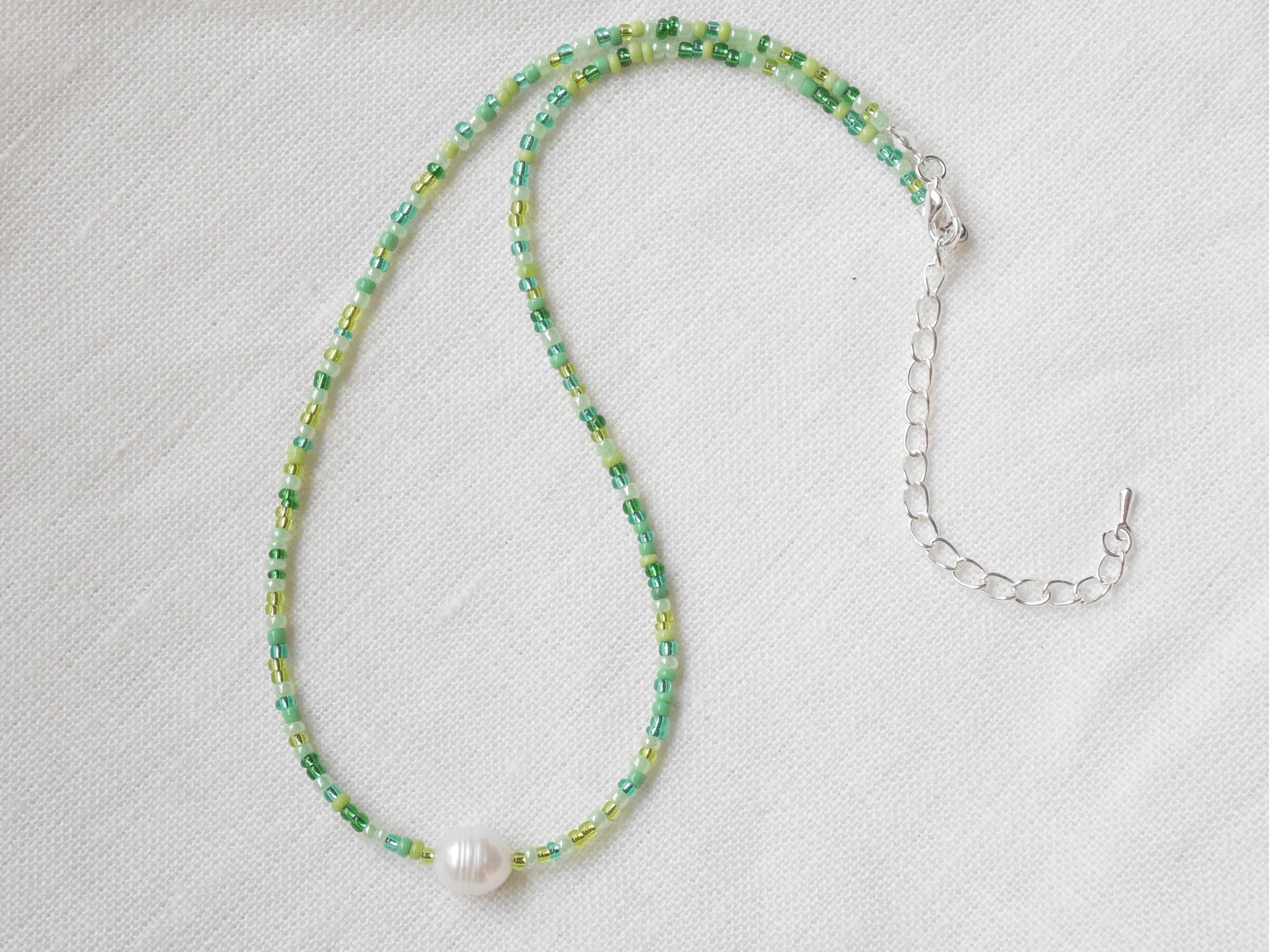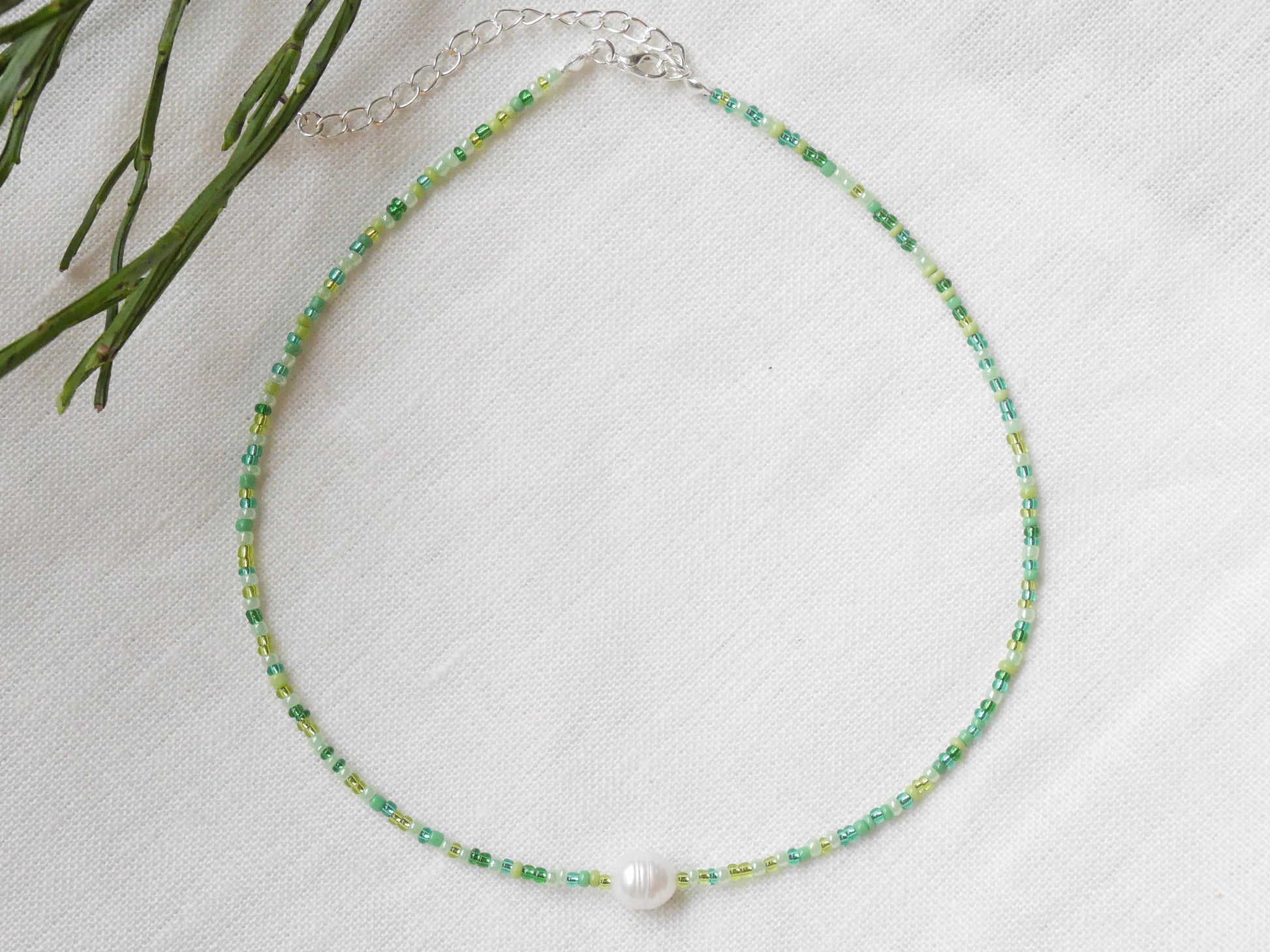 Green seed bead necklace is dainty and cute. In this silver-plated necklace, I have paired a genuine freshwater pearl with tiny seed beads in all shades of green. Beautiful, light-weight necklace that you can easily wear every day and throughout the year.
