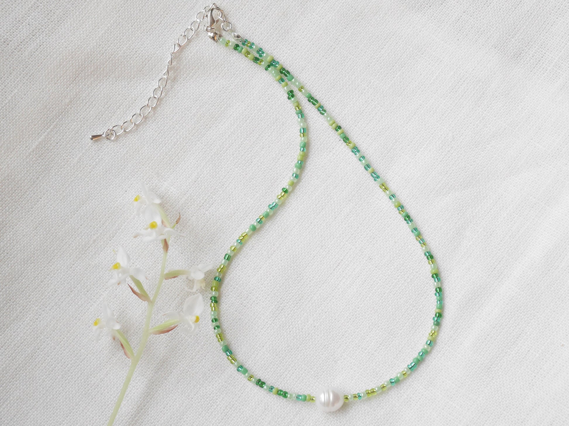 Green seed bead necklace | Freshwater pearl necklace with tiny green beads | Green glass bead necklace | Gift for someone that loves green