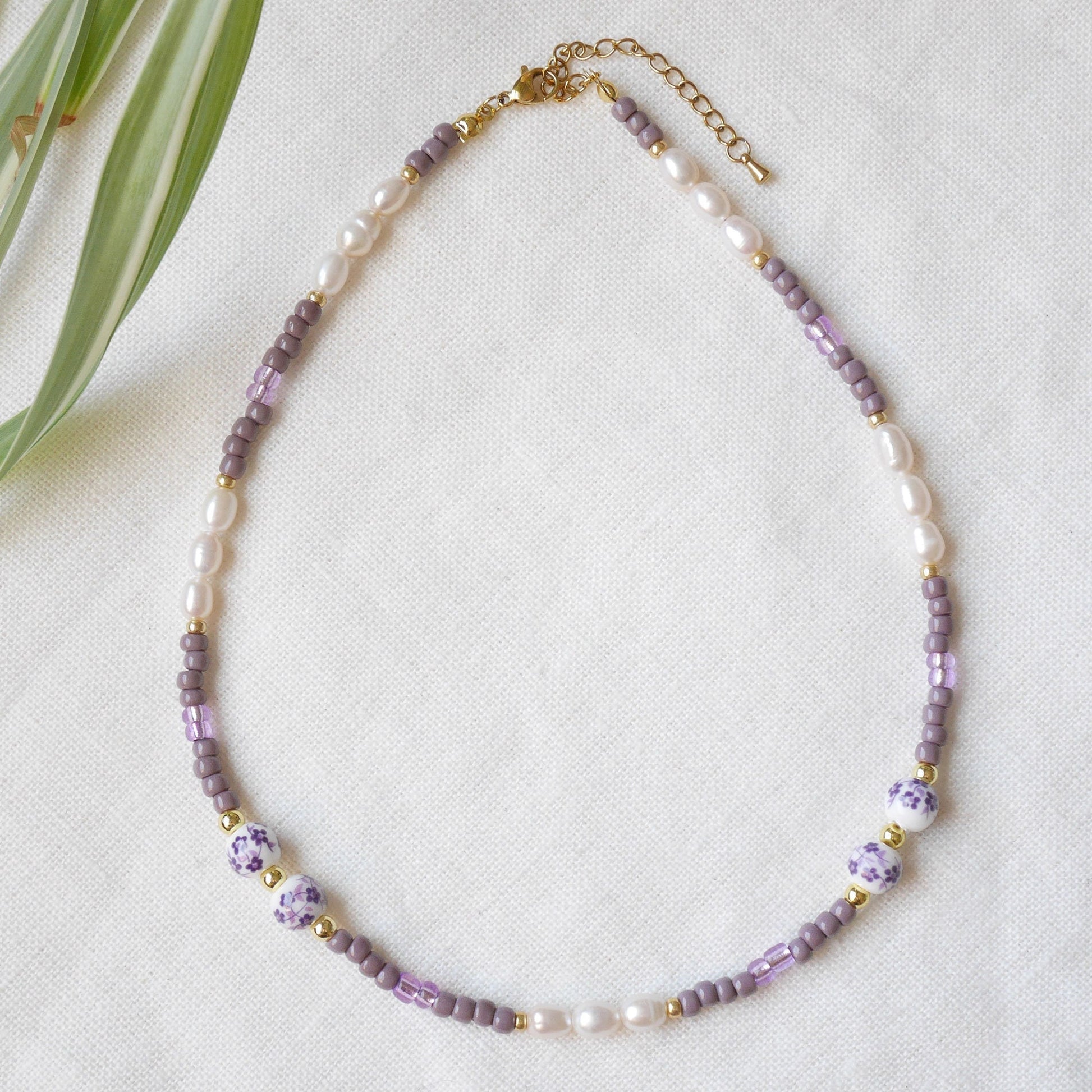 Lavender pearl necklace | Lilac porcelain bead necklace | Purple beads beaded jewelry | Cute violet seed bead freshwater pearl choker gift