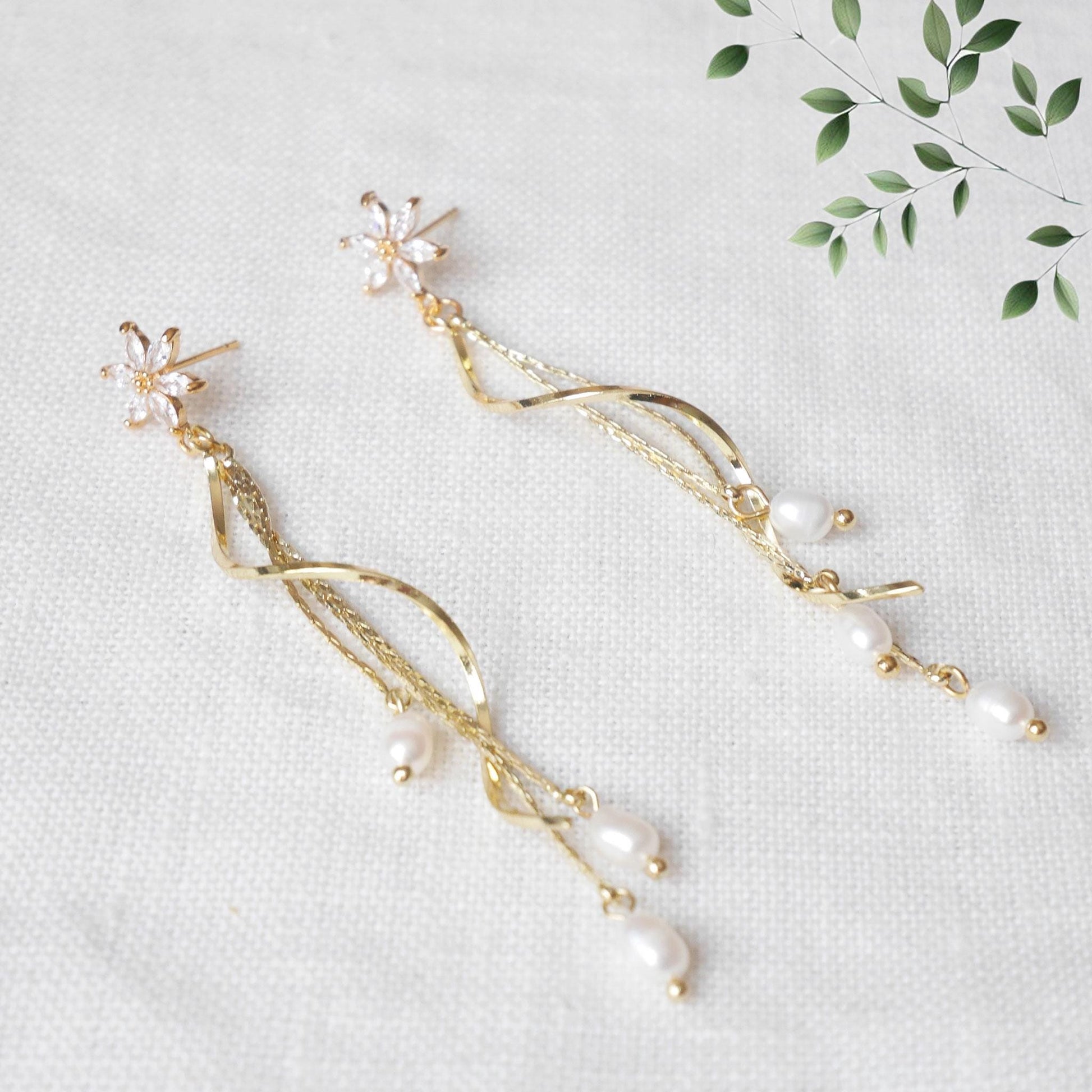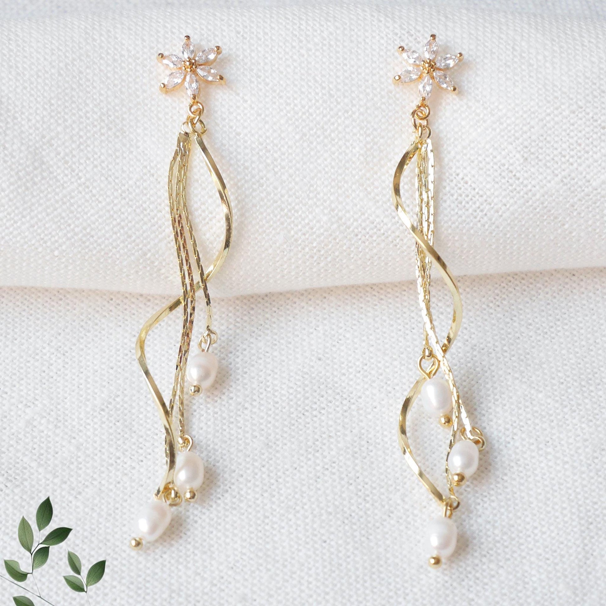 Long bridal starflower earrings are such lovely and romantic earrings. In these dainty earrings, I have paired cubic zirconia starflower studs, with wavy and straight gold-plated threads with three small freshwater pearls in each earring. Delicate and light-weight. Perfect elegant wedding earrings for the bride.