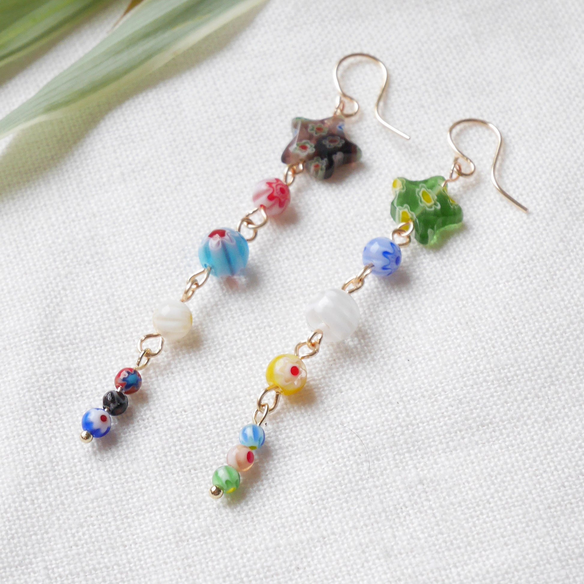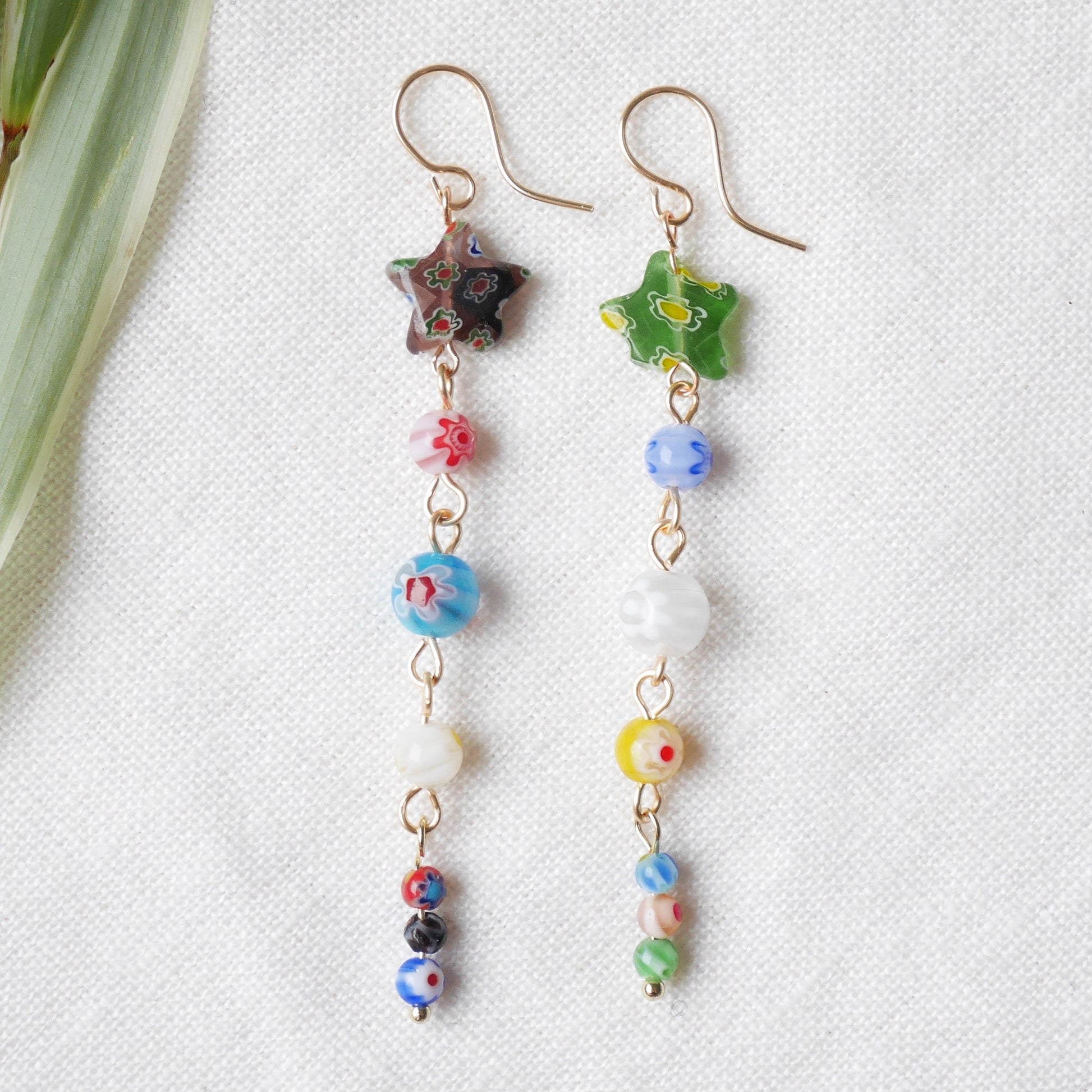 Long millefiori glass earrings – colorful bead statement dangle star jewelry