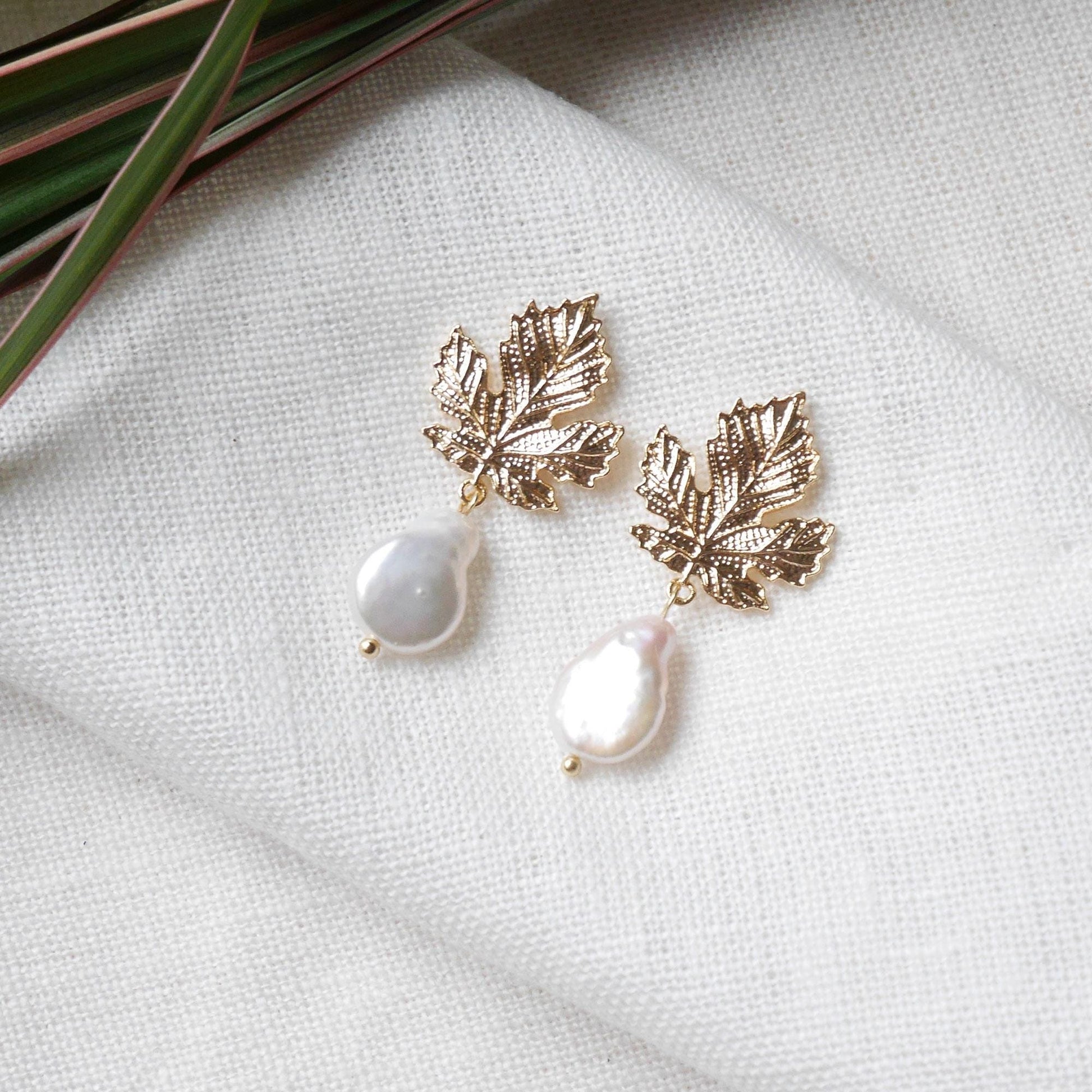 Maple leaf freshwater pearl earrings are such beautiful minimalist earrings with large gold-plated maple leaves (stud earrings) and genuine teardrop shape freshwater pearls.
