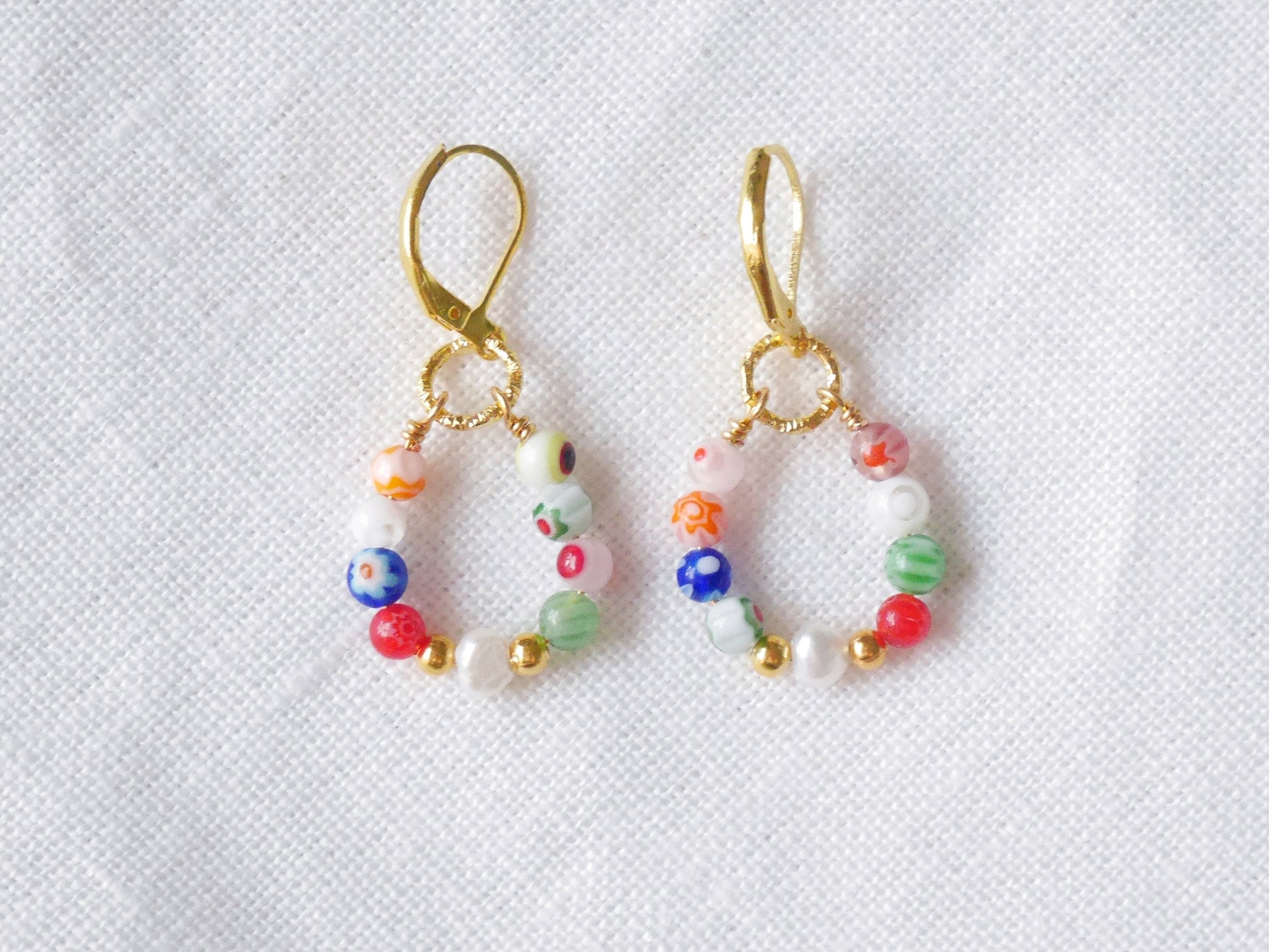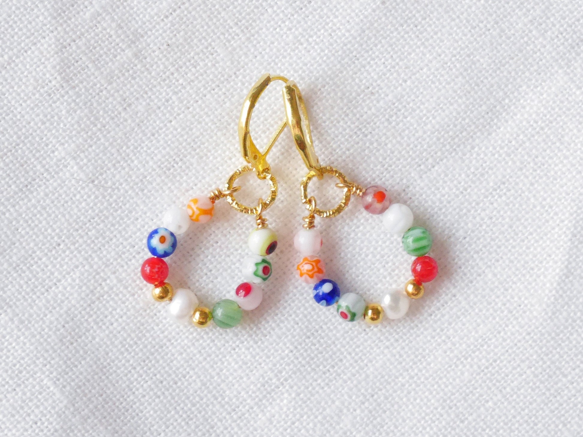 Millefiori pearl earrings | Colorful hoop drop earrings | Small glass bead earrings with multicolor beads | Colorful gold earrings leverback