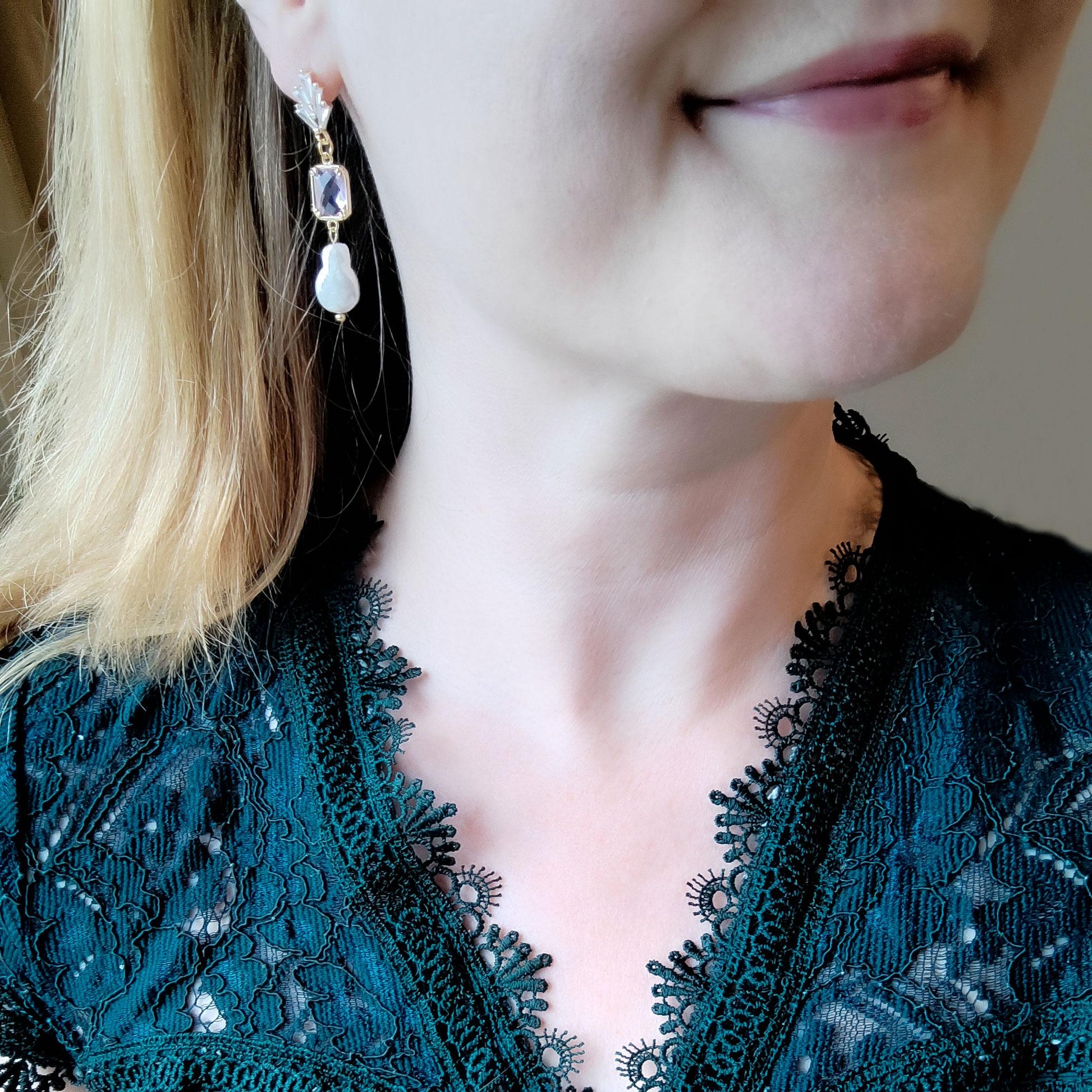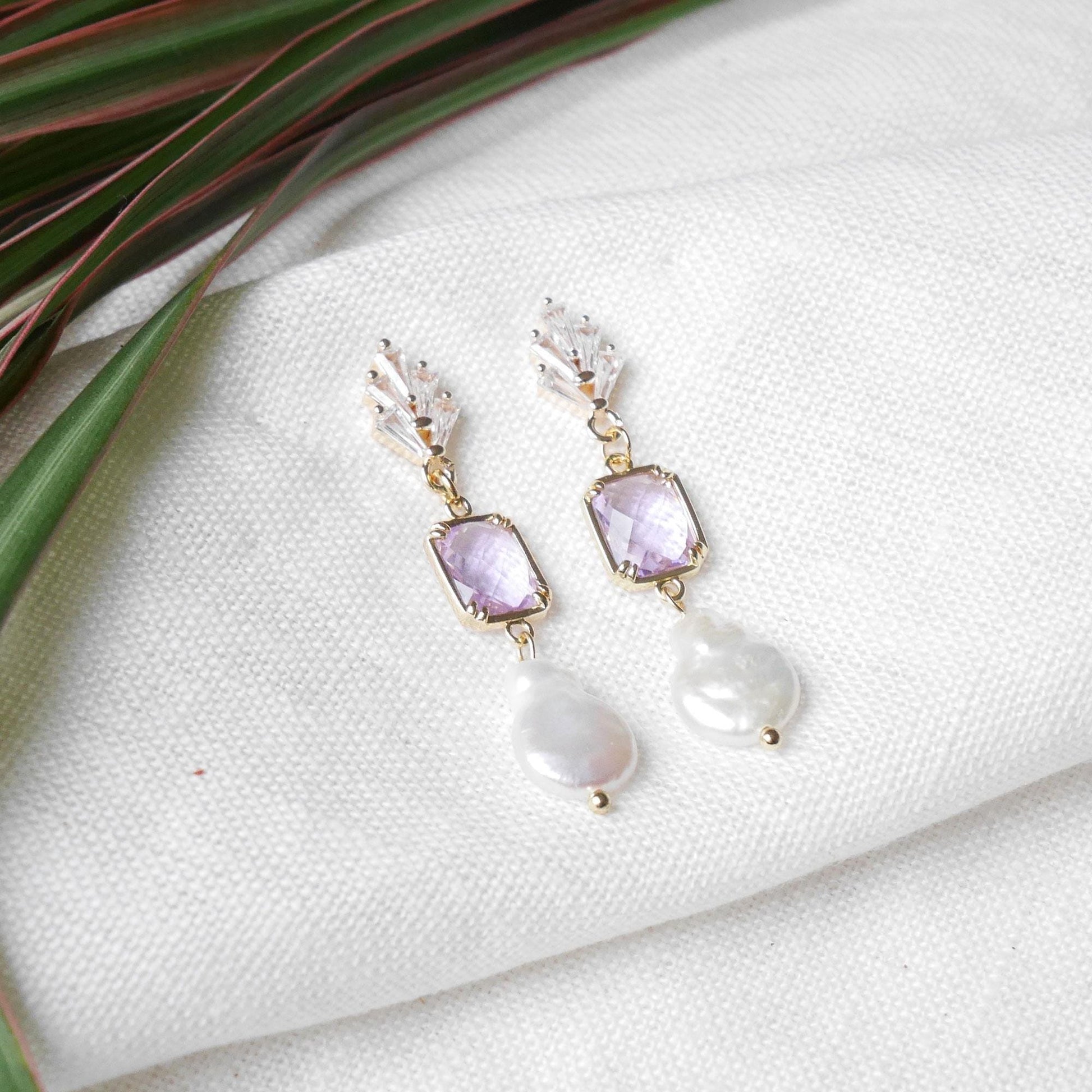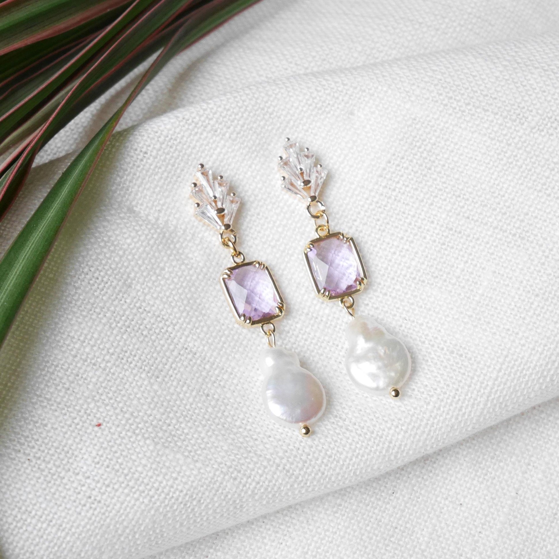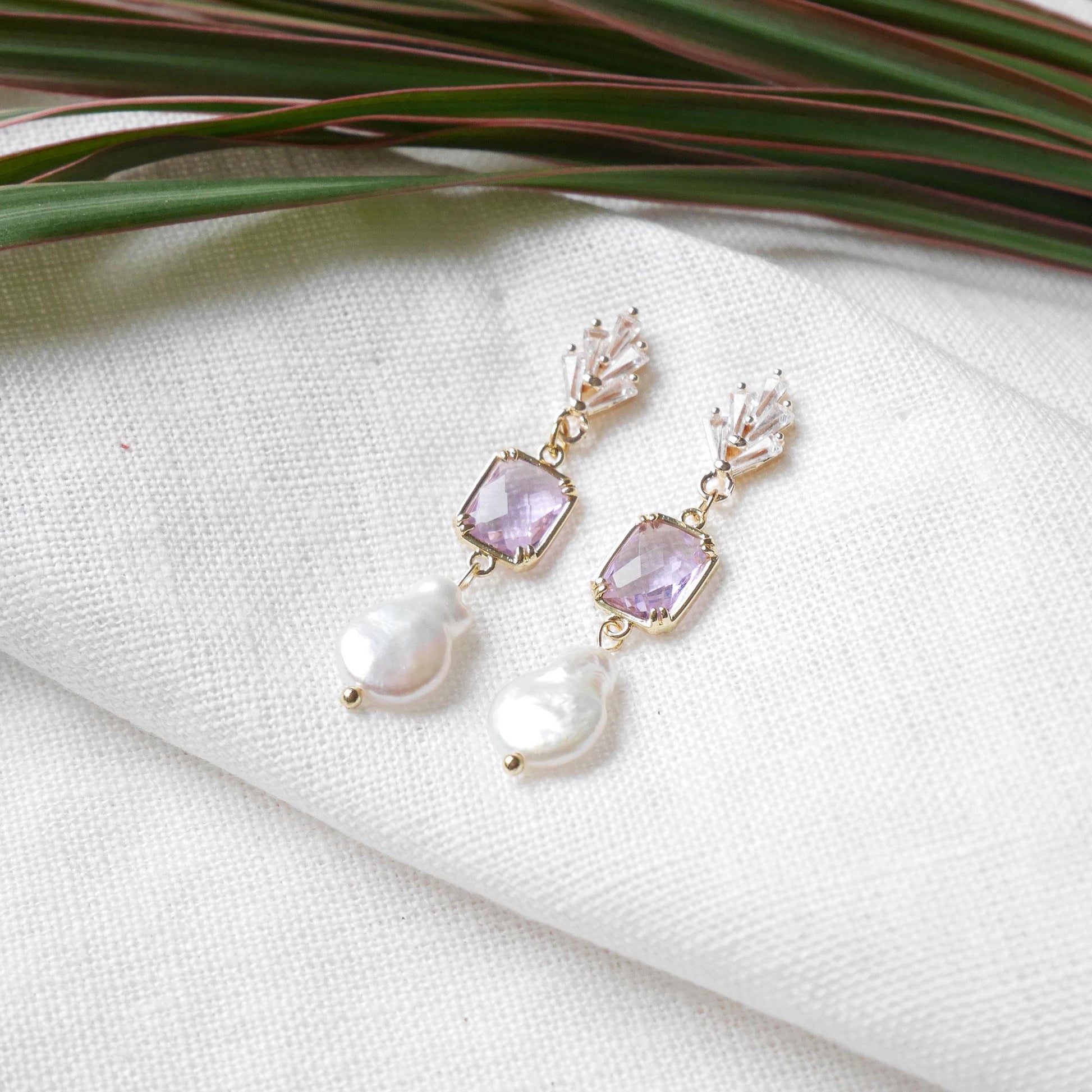 Purple bridal earrings are dainty and cute. They have an art deco vintage look, inspired by the 1920s. The earrings are delicate and really beautiful - zircon stones, gold-plated brass with light purple glass and genuine teardrop shape freshwater pearls.