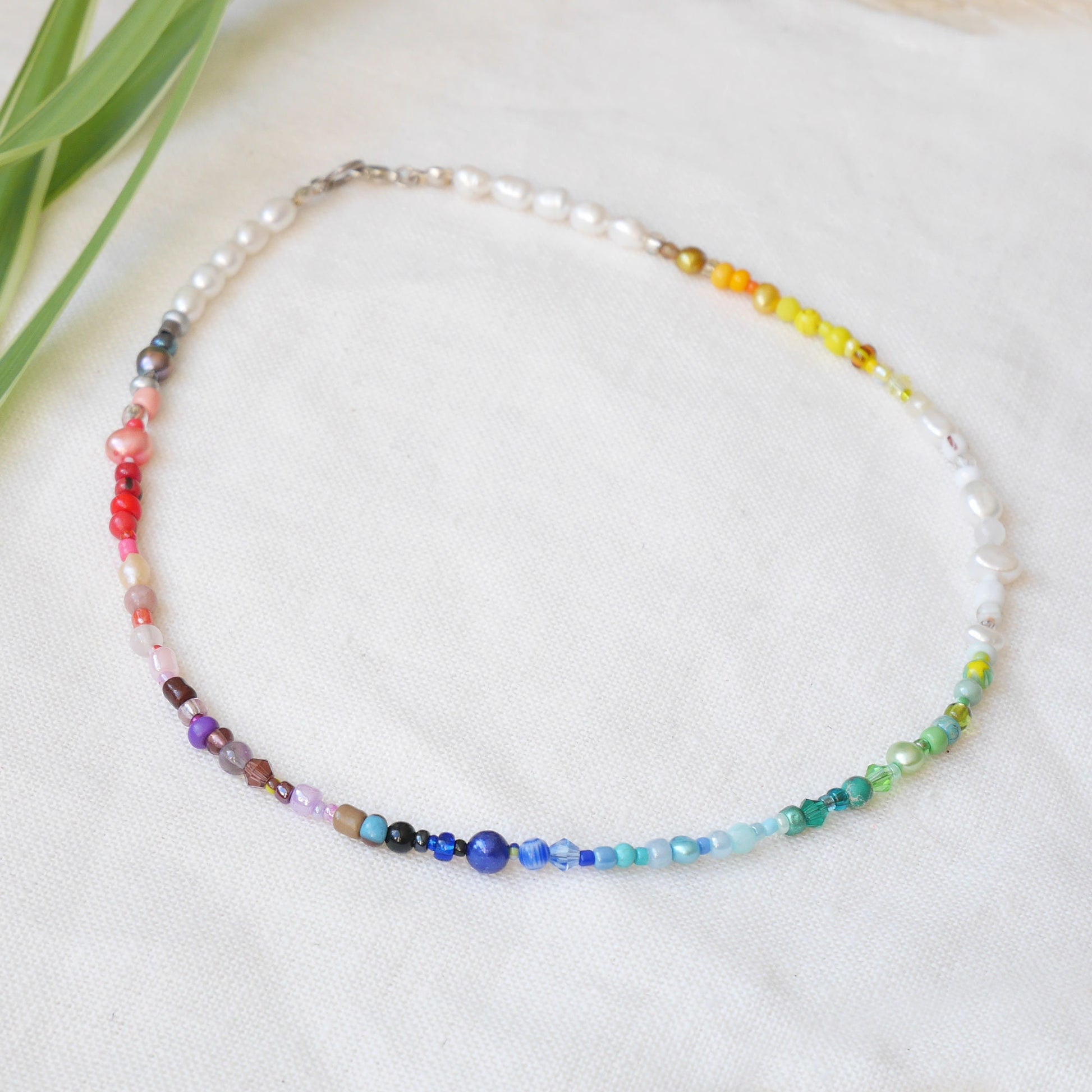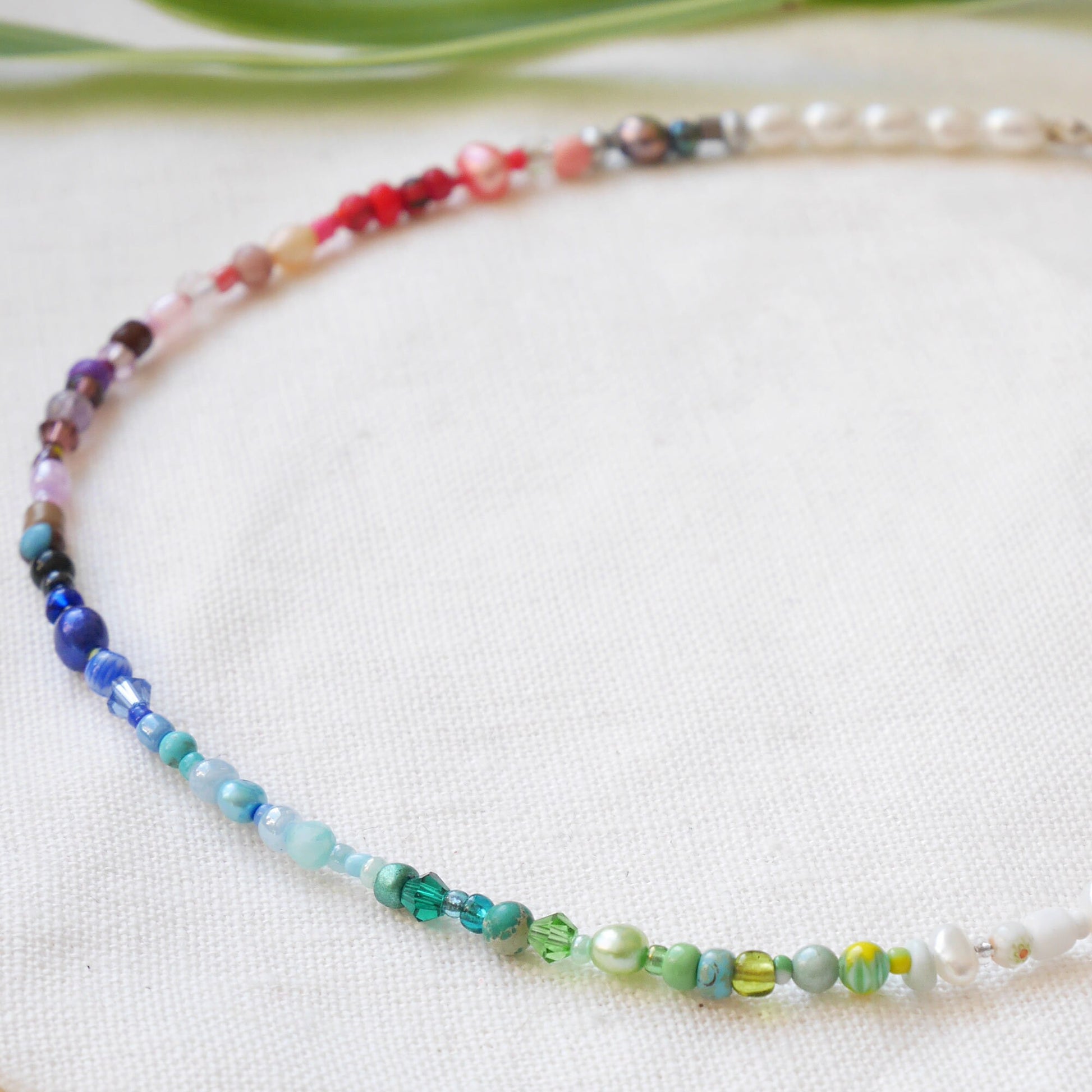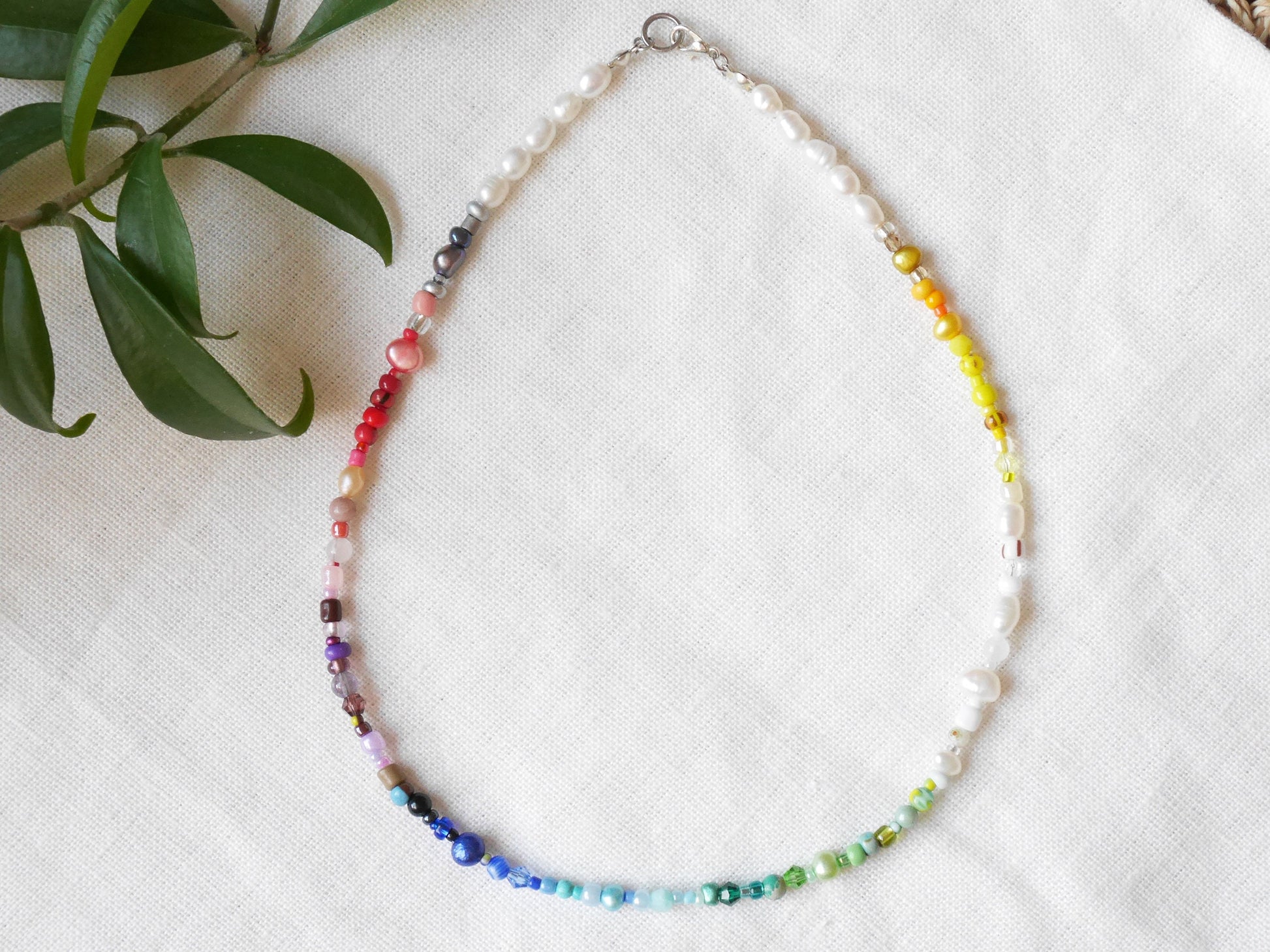 Rainbow beaded necklace is a beautiful colorful necklace with a huge selection of different kinds of beads. In this silver-plated necklace, there are genuine freshwater pearls in different shapes, sizes and colors, glass beads (seed beads, crystal glass beads, millefiori etc.), and gemstones. Each necklace is a unique piece made to order - the order and the selection of beads may vary.