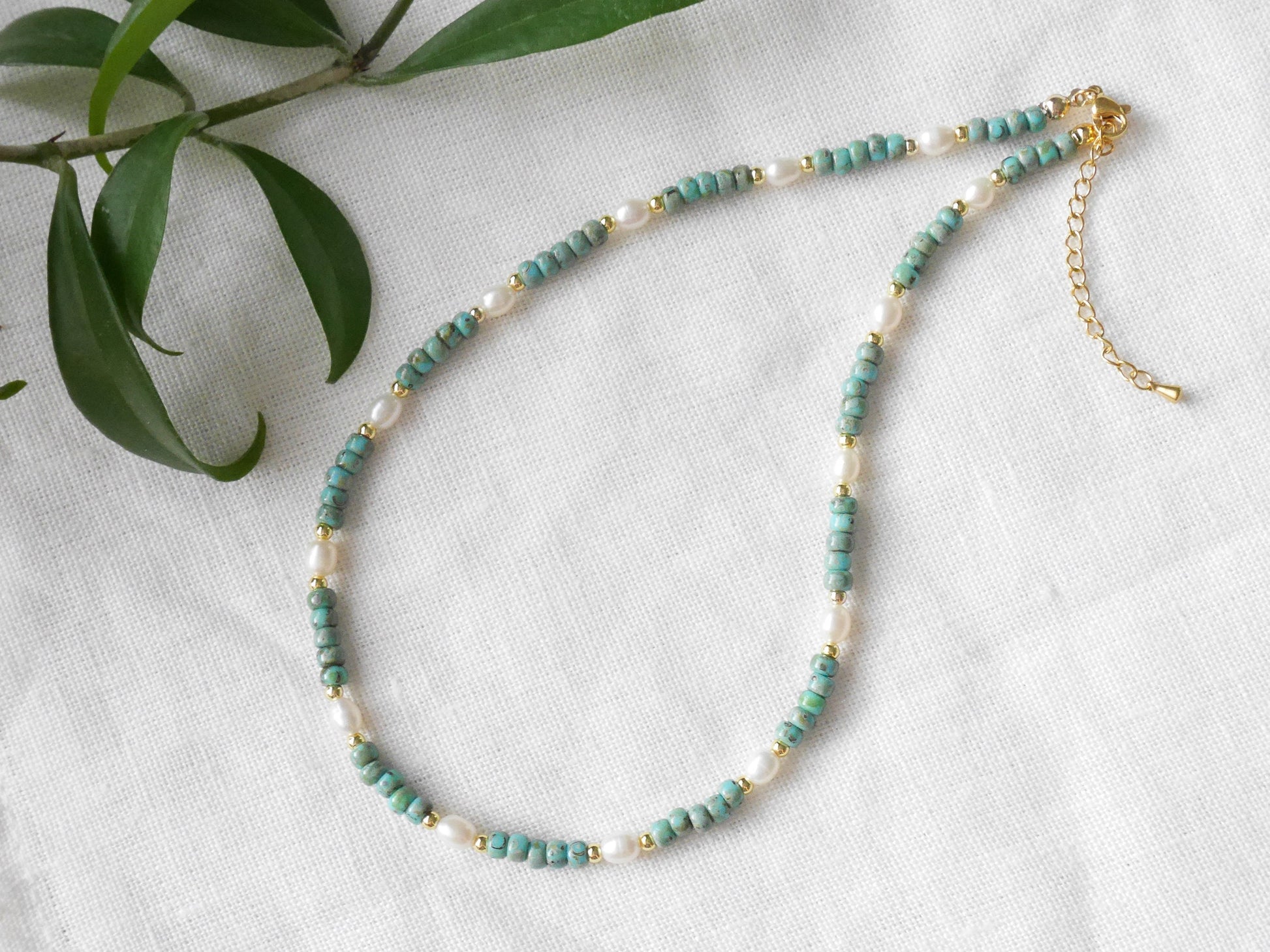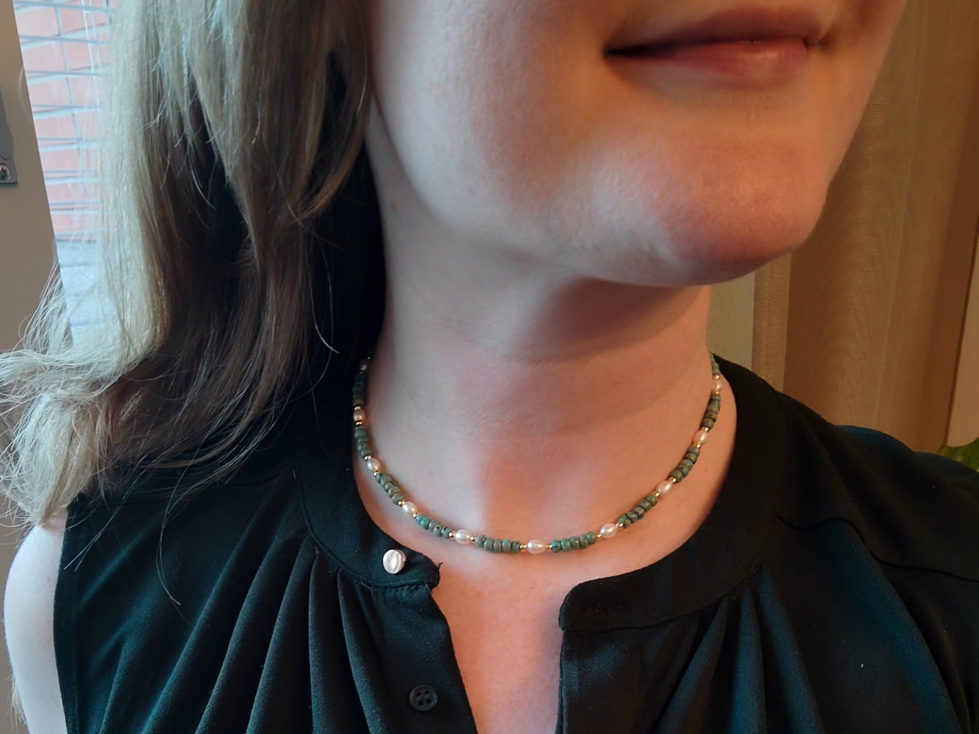 Seafoam beaded necklace is such a cute timeless necklace. In this beautiful necklace, I have paired dark turquoise/seafoam tone high quality Japanese Miyuki Picasso glass seed beads (4 mm), with genuine freshwater pearls and small 14k gold-plated beads. Lovely necklace, easy to wear every day.