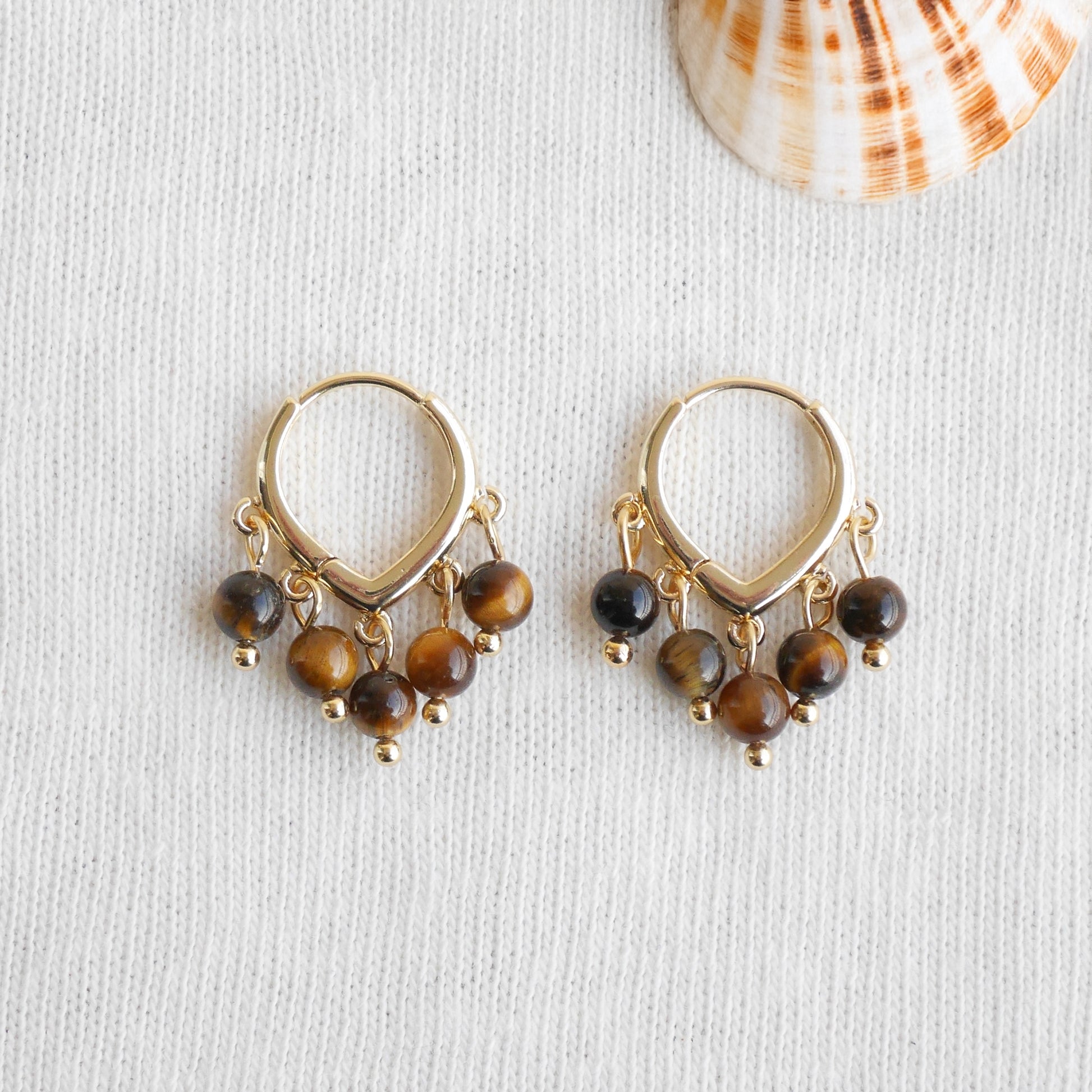 The earrings are high-quality 14k gold plated brass, with five beautiful tiger eye stone beads each.