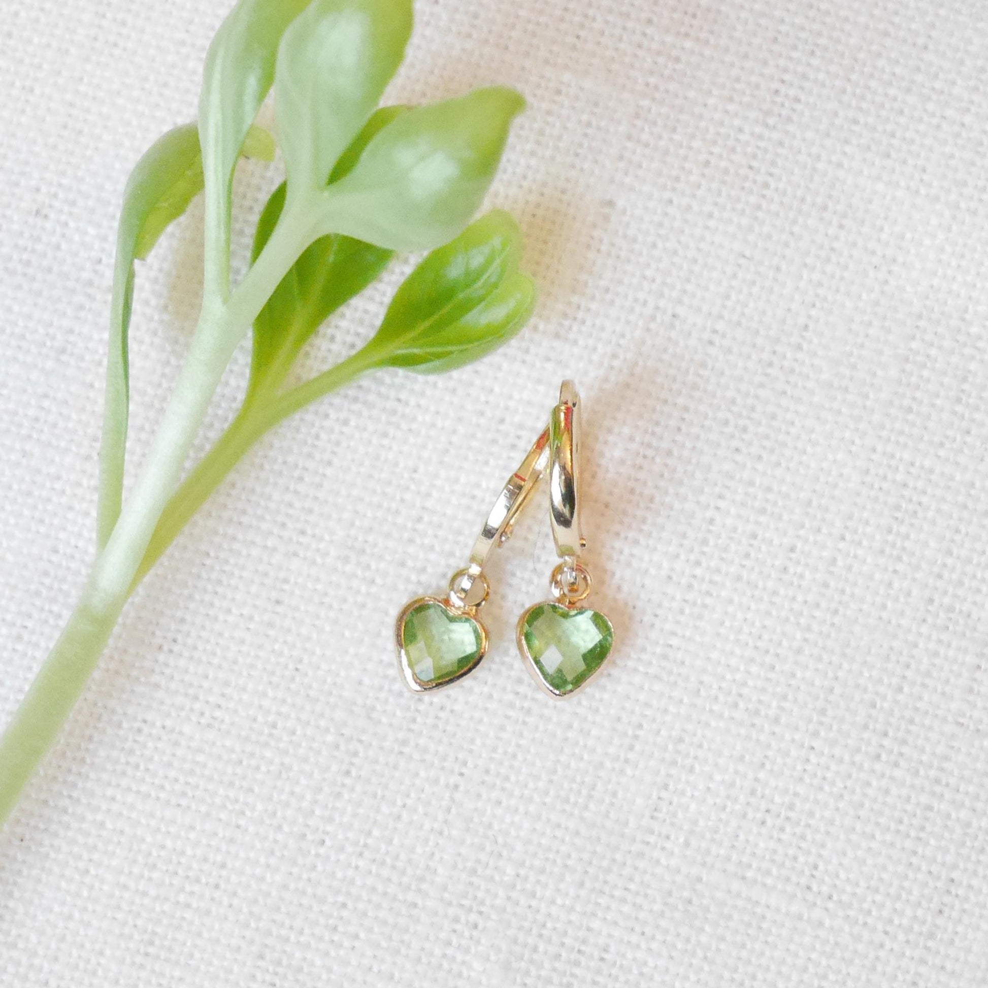 Tiny birthstone heart earrings are so dainty and cute. Perfect to wear every day, these small hoops are just adorable. The hoops are 14k gold-plated brass and they come with your choice of heart shaped glass birthstone charms. Choose your own birthstones or give as a gift. Mismatched pair also available!