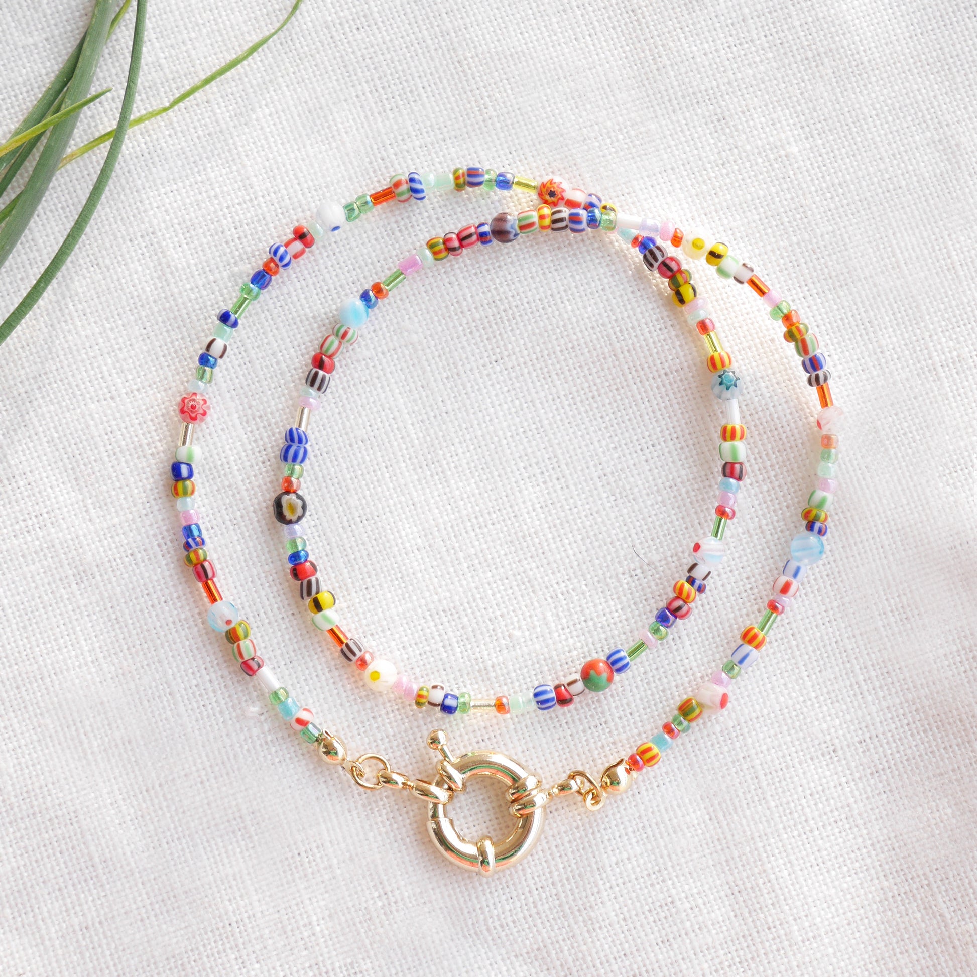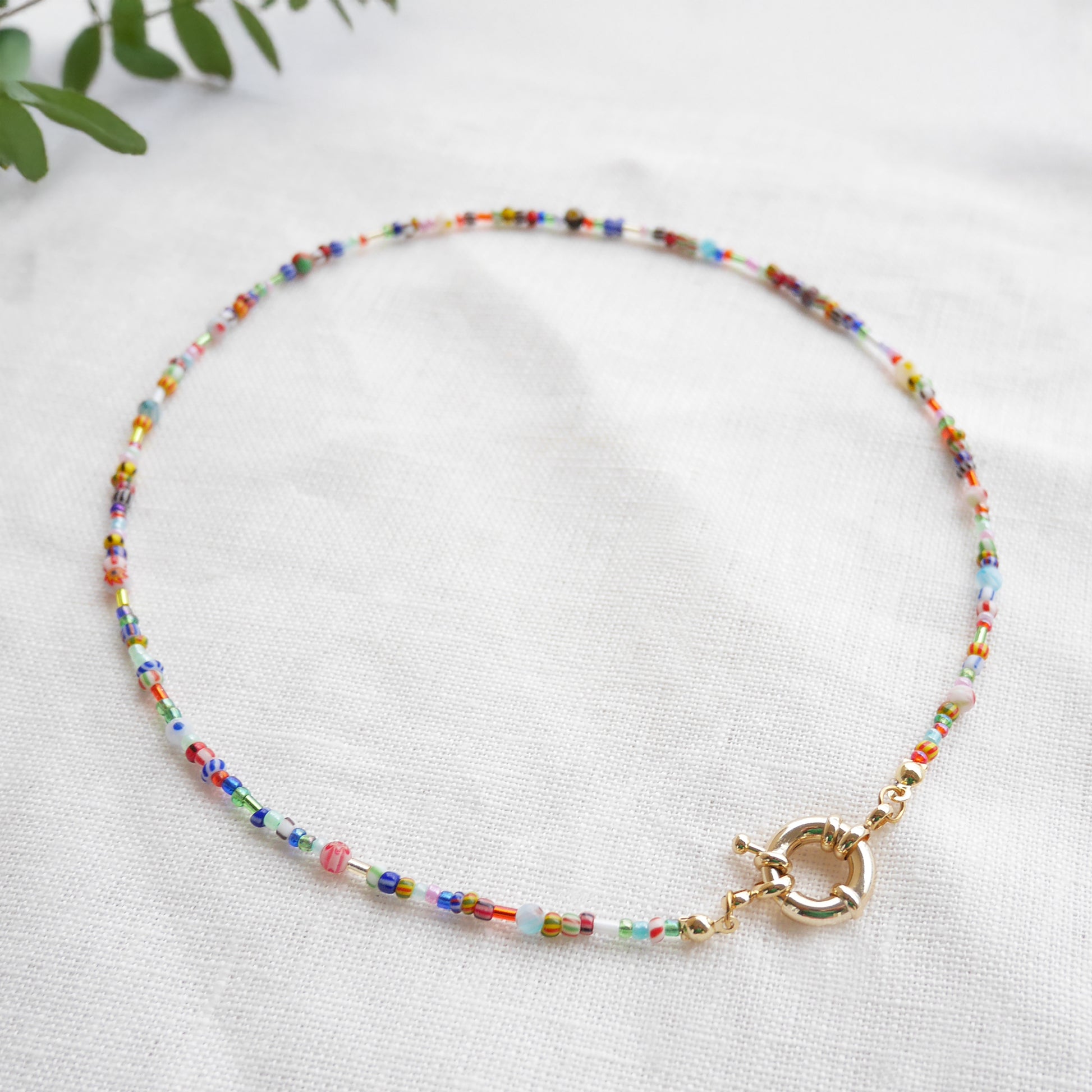 In this light-weight necklace, I have paired different kinds of tiny glass beads - striped and colorful seed beads, tube beads and millefiori beads - with a beautiful gold-plated spring ring clasp in the front (or in the back, if you want just the beads in the front).