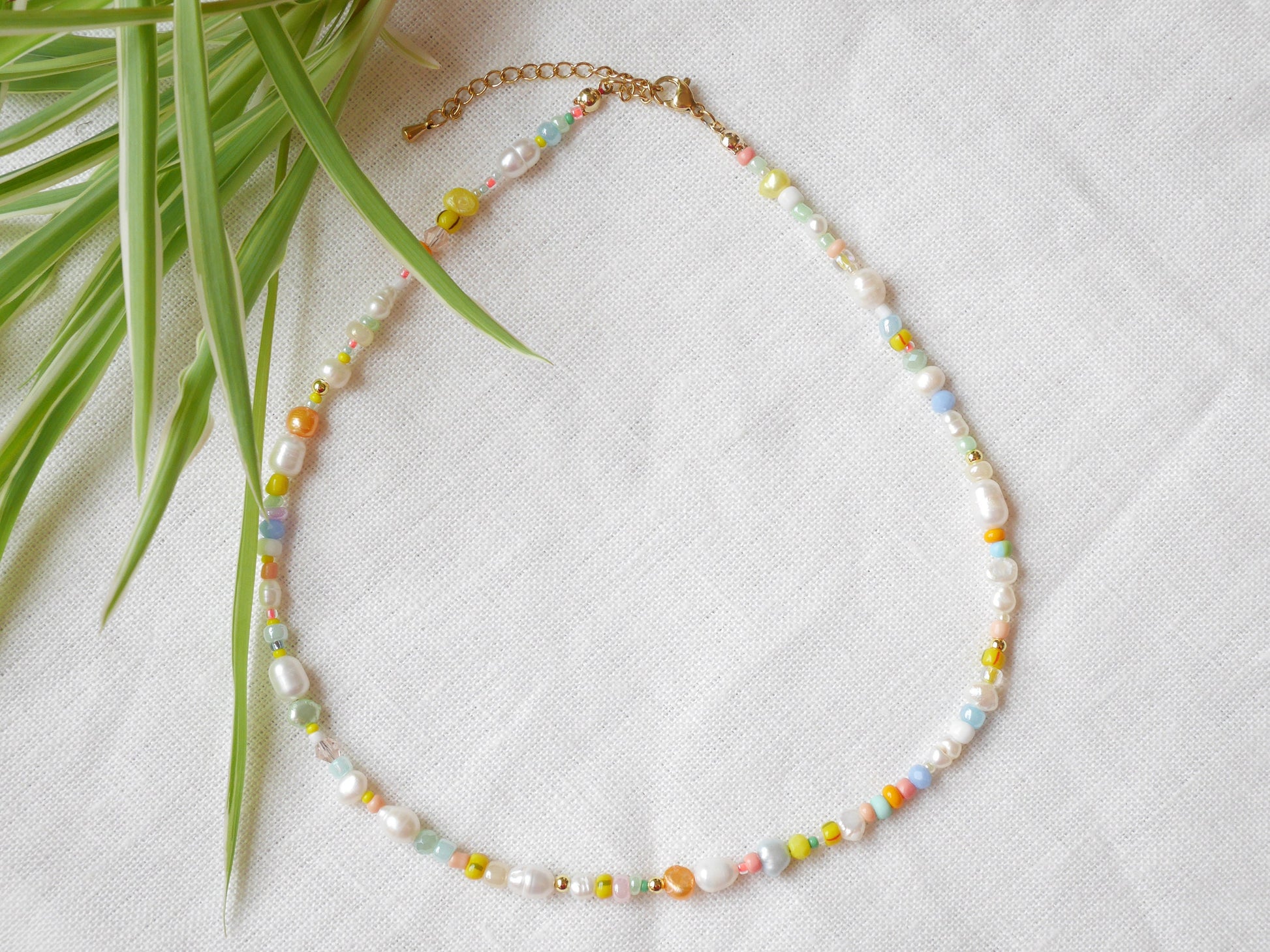 Tropical beads necklace "Tropical" is such a cute necklace! In this beaded necklace, I have paired genuine freshwater pearls of different shapes, sizes and colors, with small colorful glass beads.
