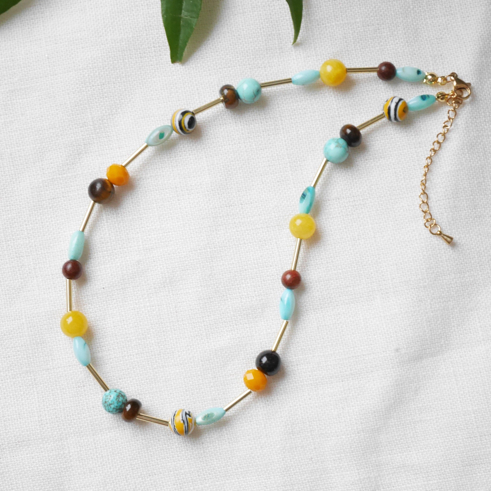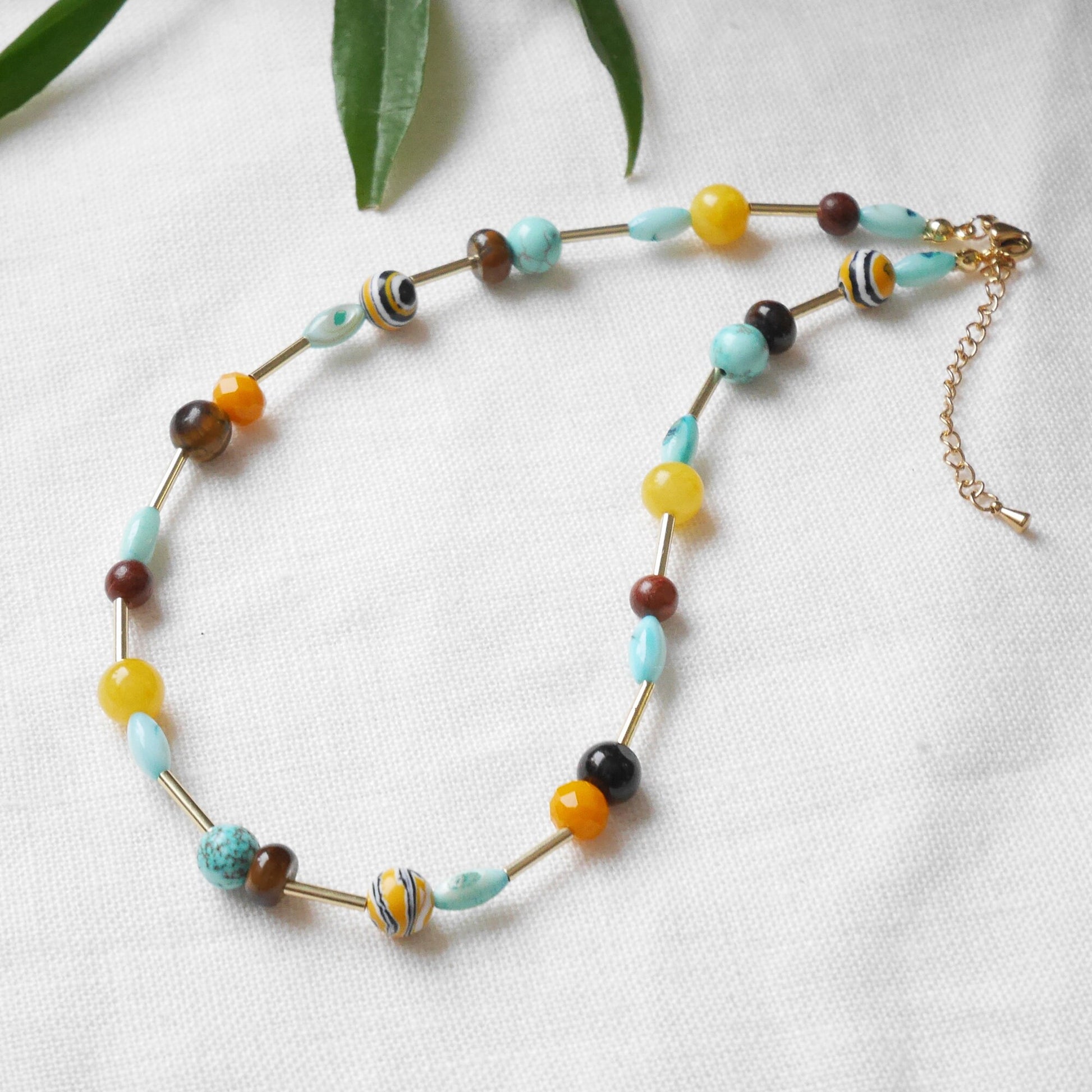 Turquoise and yellow beads necklace | Mixed colors beaded necklace | Multicolor gemstone choker | Happy cute handmade jewelry gift for woman