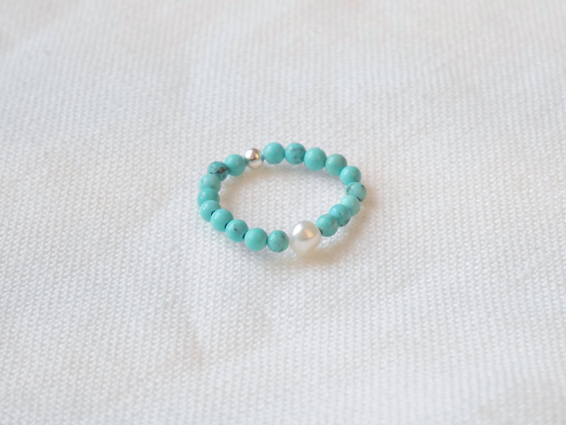 Turquoise beads ring is so cute. In this elastic ring, I have paired turquoise stone beads with a small baroque freshwater pearl and a silver-plated bead.