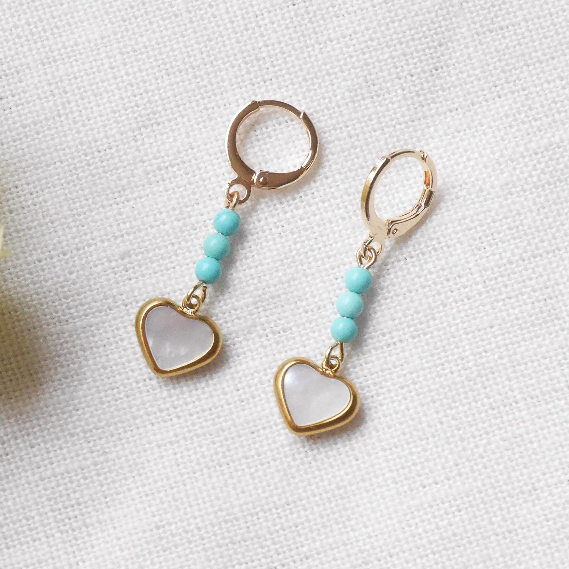 Turquoise heart earrings | Turquoise stone dangle hoop earrings | Light blue huggie hoop natural shell drop earring | Cute love gift for her